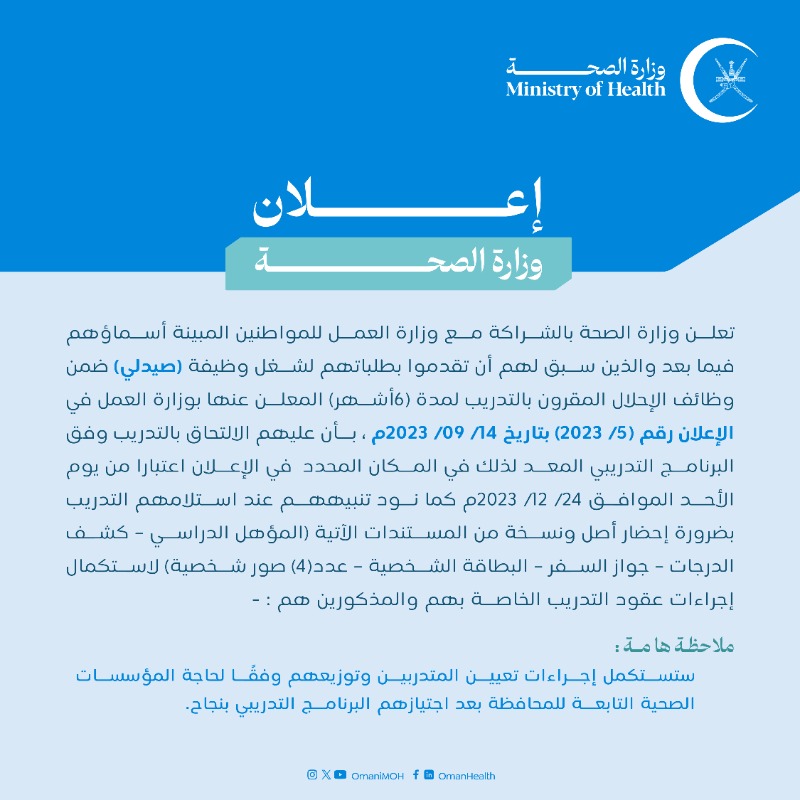 وزارة الصحة - أسماء مواطنين لاستكمال اجراءات عقود التدريب لشغل الوظائف ( صيدلي )