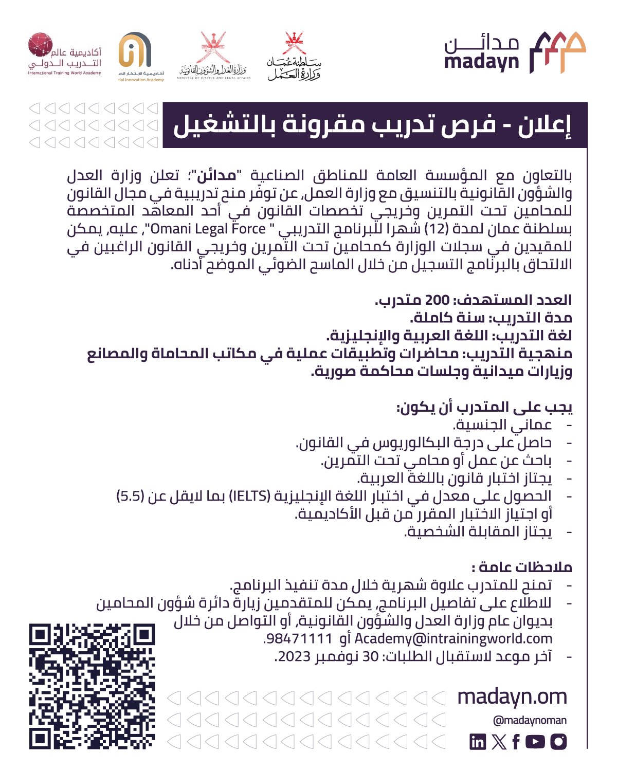 المؤسسة العامة للمناطق الصناعية مدائن - فرص تدريب مقرونة بالتشغيل في مجال القانون للمحامين تحت التمرين وخريجي تخصصات القانون