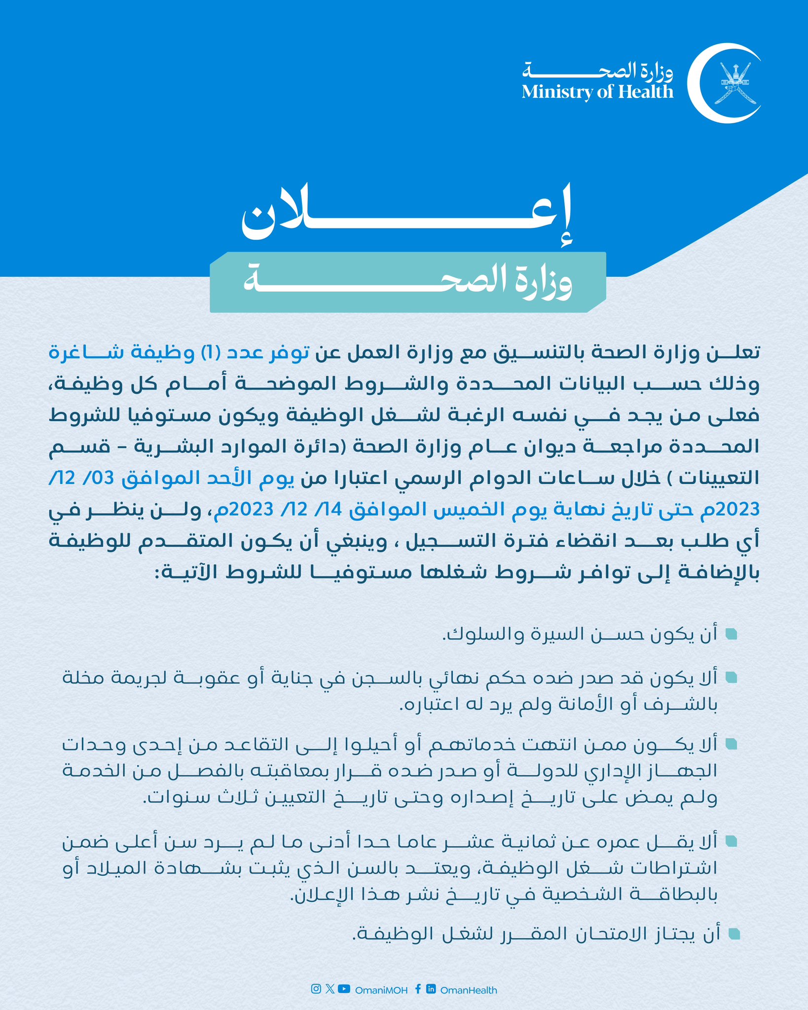 وزارة الصحة تُعلن عن توفر عدد (1) وظيفة شاغرة لشغل وظيفة (فني "أ" علم الجينات) http