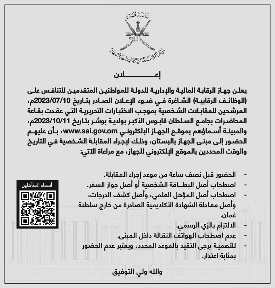 جهاز الرقابة المالية والادارية للدولة - اسماء مواطنين لإجراء المقابلة الشخصية للتنافس على الوظائف الرقابية