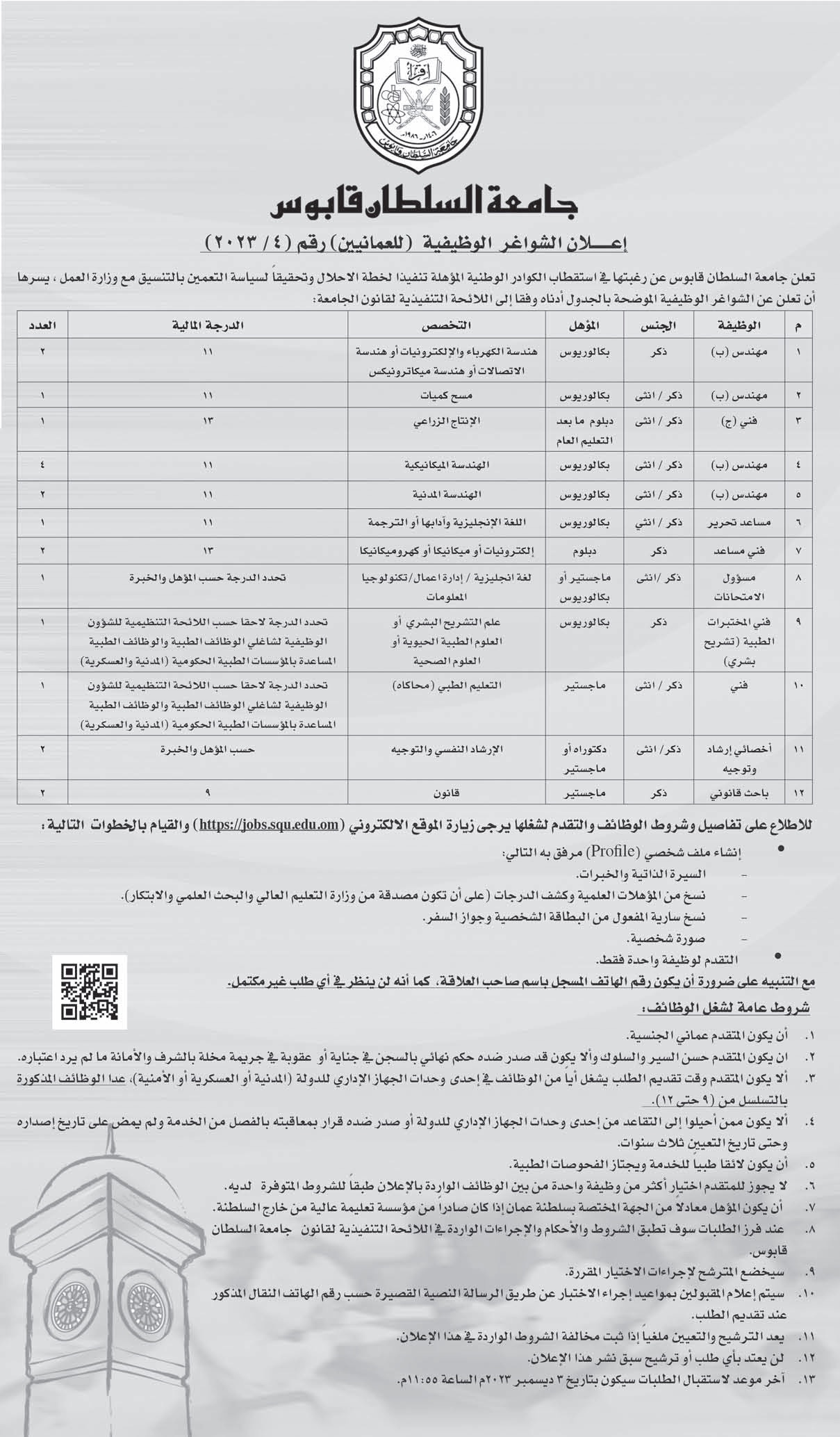 جامعة السلطان قابوس - اعلان الوظائف الشاغرة رقم ( 4 / 2023 )