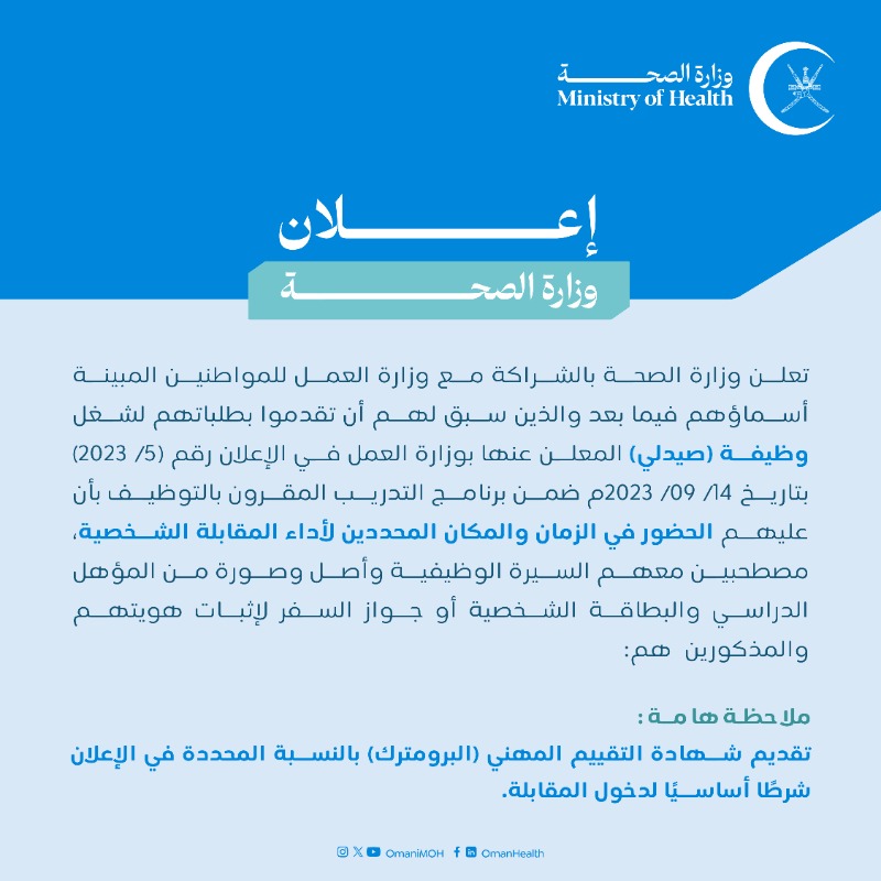 وزارة الصحة - أسماء مواطنين لإجراء المقابلة الشخصية لشغل وظيفة ( صيدلي )