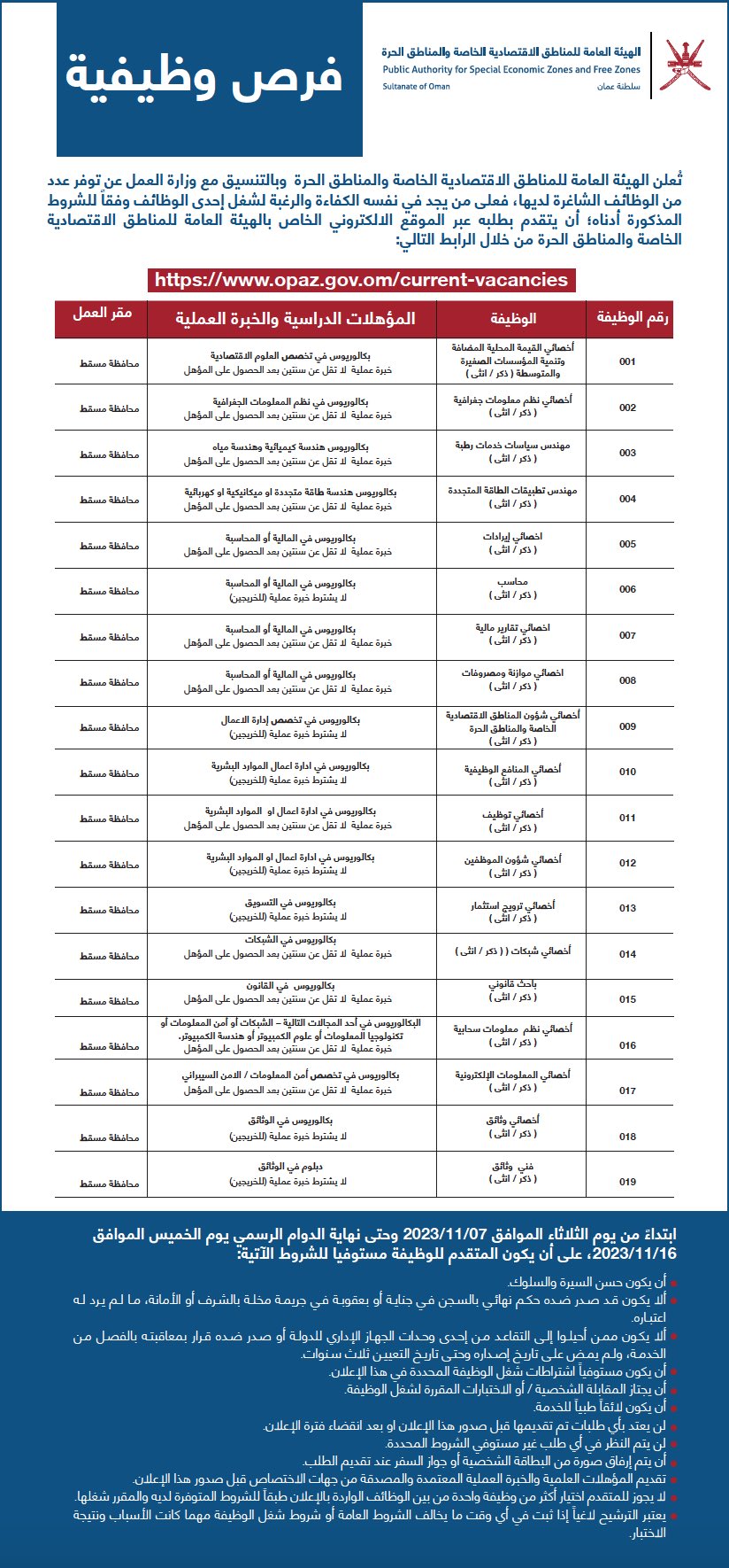 الهيئة العامة للمناطق الاقتصادية الخاصة والمناطق الحرة وبالتنسيق مع وزارة العمل - وظائف شاغرة