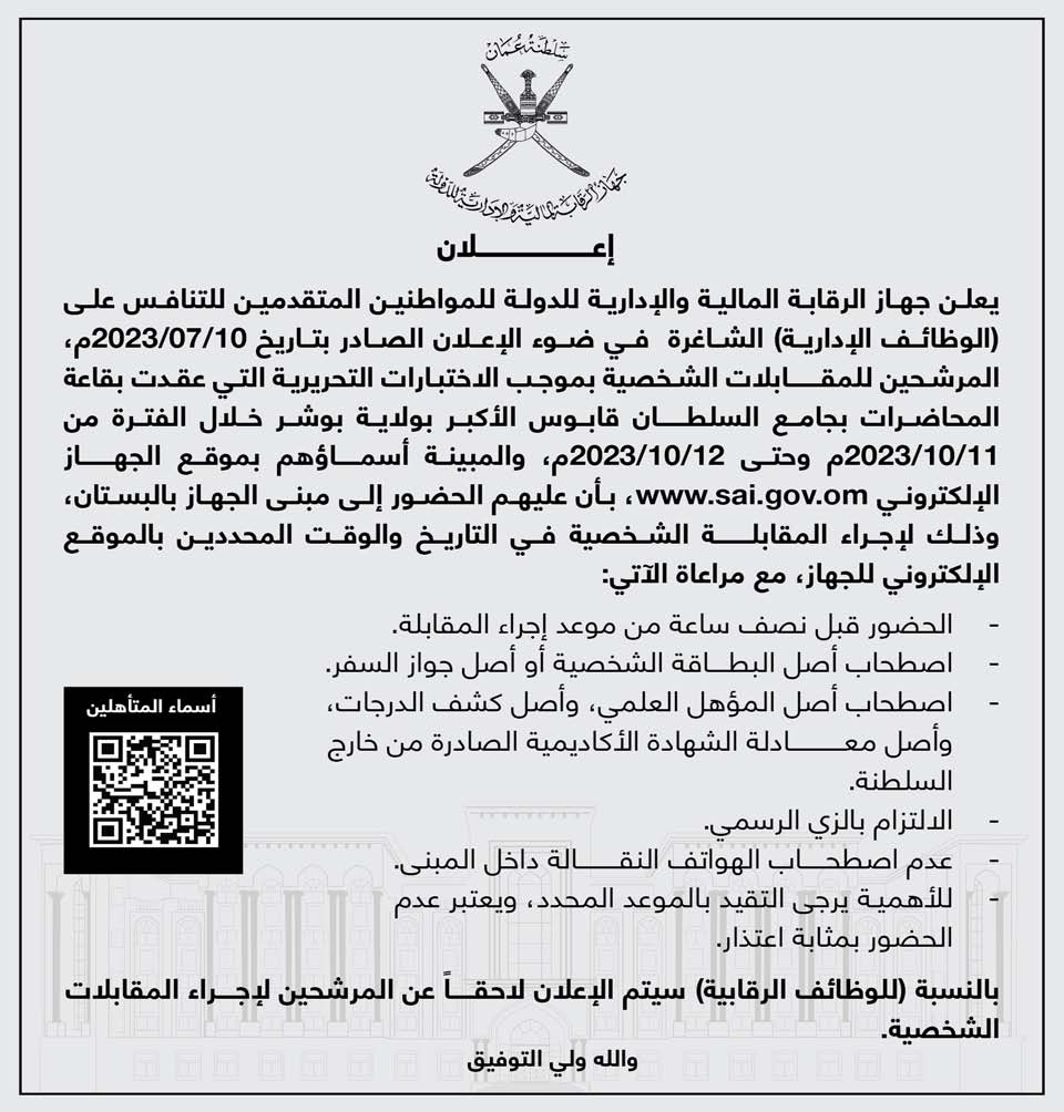 جهاز الرقابة المالية والادارية للدولة - أسماء مواطنين لإجراء المقابلة الشخصية