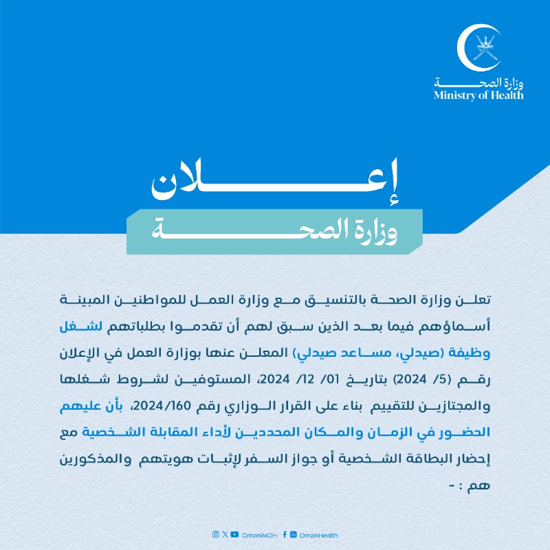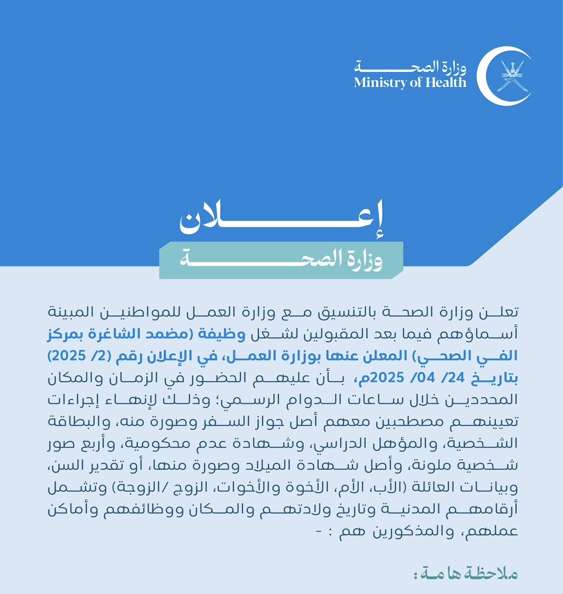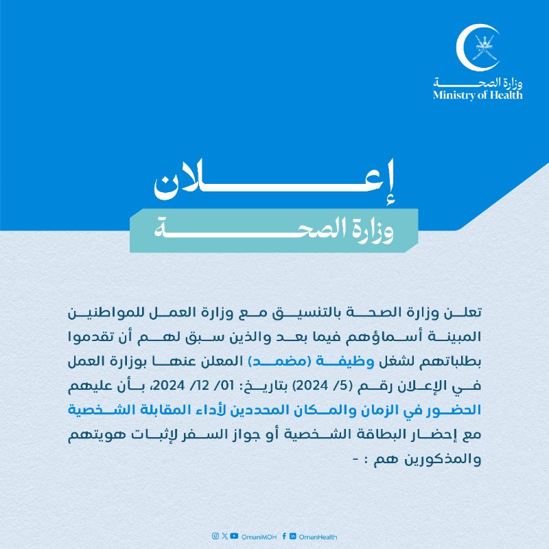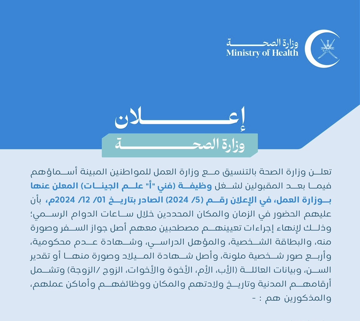 وزارة الصحة - إعلان بأسماء المواطنات لاستكمال إجراءات التعيين لشغل وظيفة (مضمد) بمركز الفي الصحي