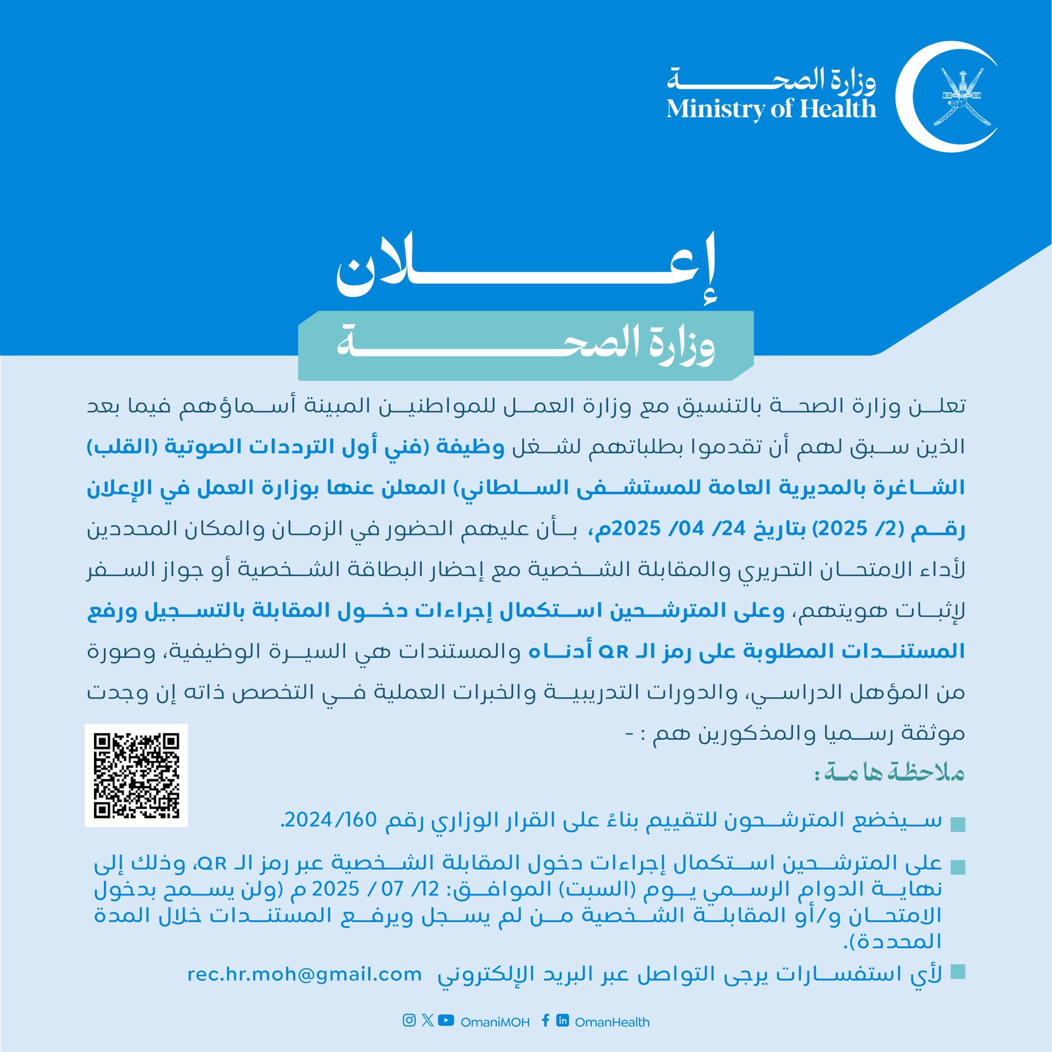 وزارة الصحة - أسماء مواطنين لأداء الامتحان التحريري والمقابلة الشخصية واستكمال إجراءات دخول المقابلة لشغل وظيفة (فني أول الترددات الصوتية (القلب)
