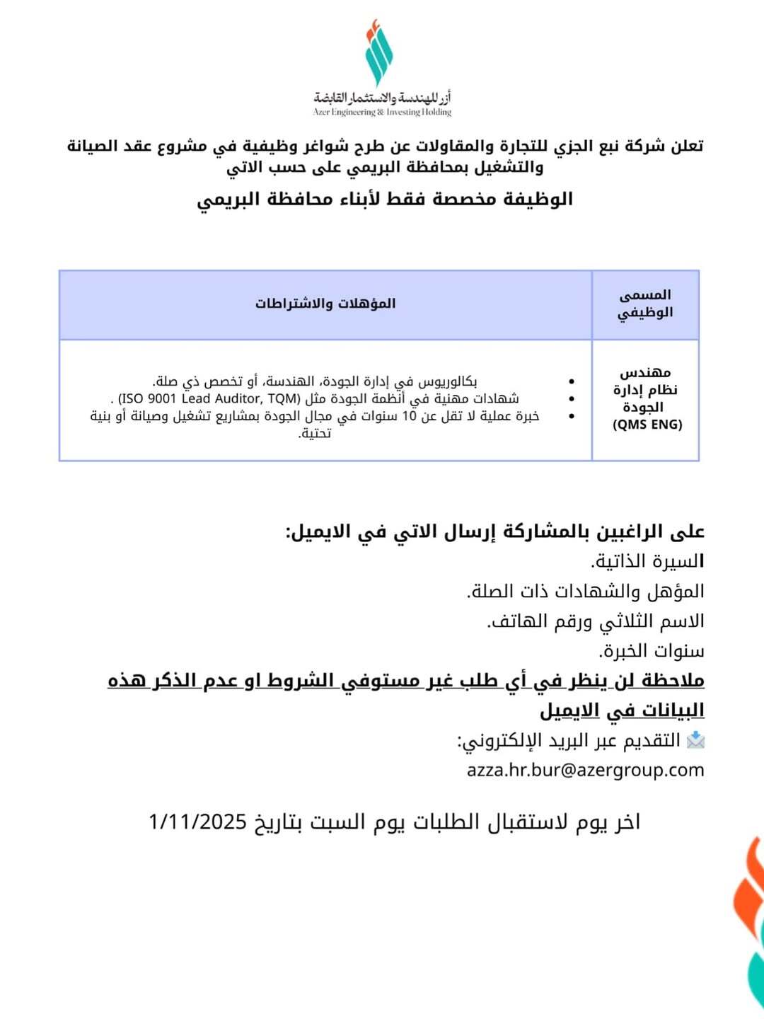 شركة نبع الجزي للتجارة والمقاولات في البريمي - وظيفة شاغرة ( مهندس نظام إدارة الجودة (QMS ENG)