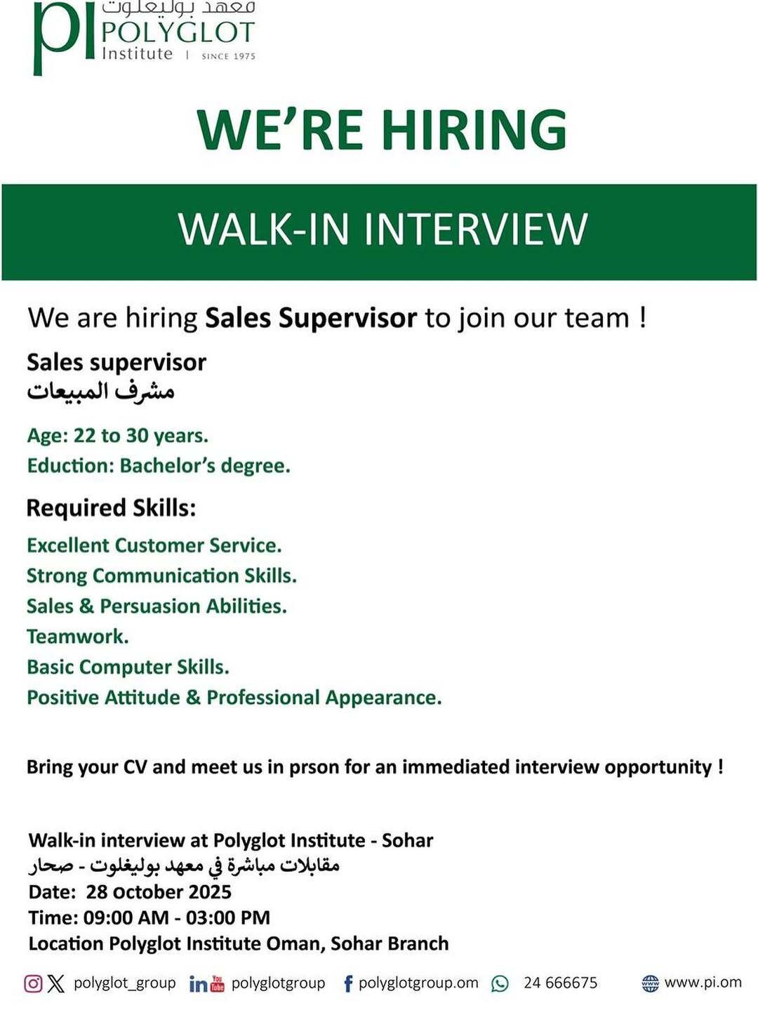 معهد بوليغلوت فرع صحار - مقابلات مباشرة لشغل وظيفة ( مشرف المبيعات )