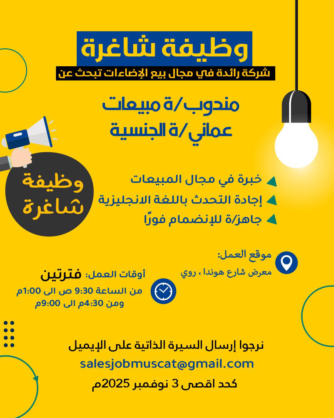 شركة رائدة في مجال بيع الإضاءات - وظيفتين شاغرتين