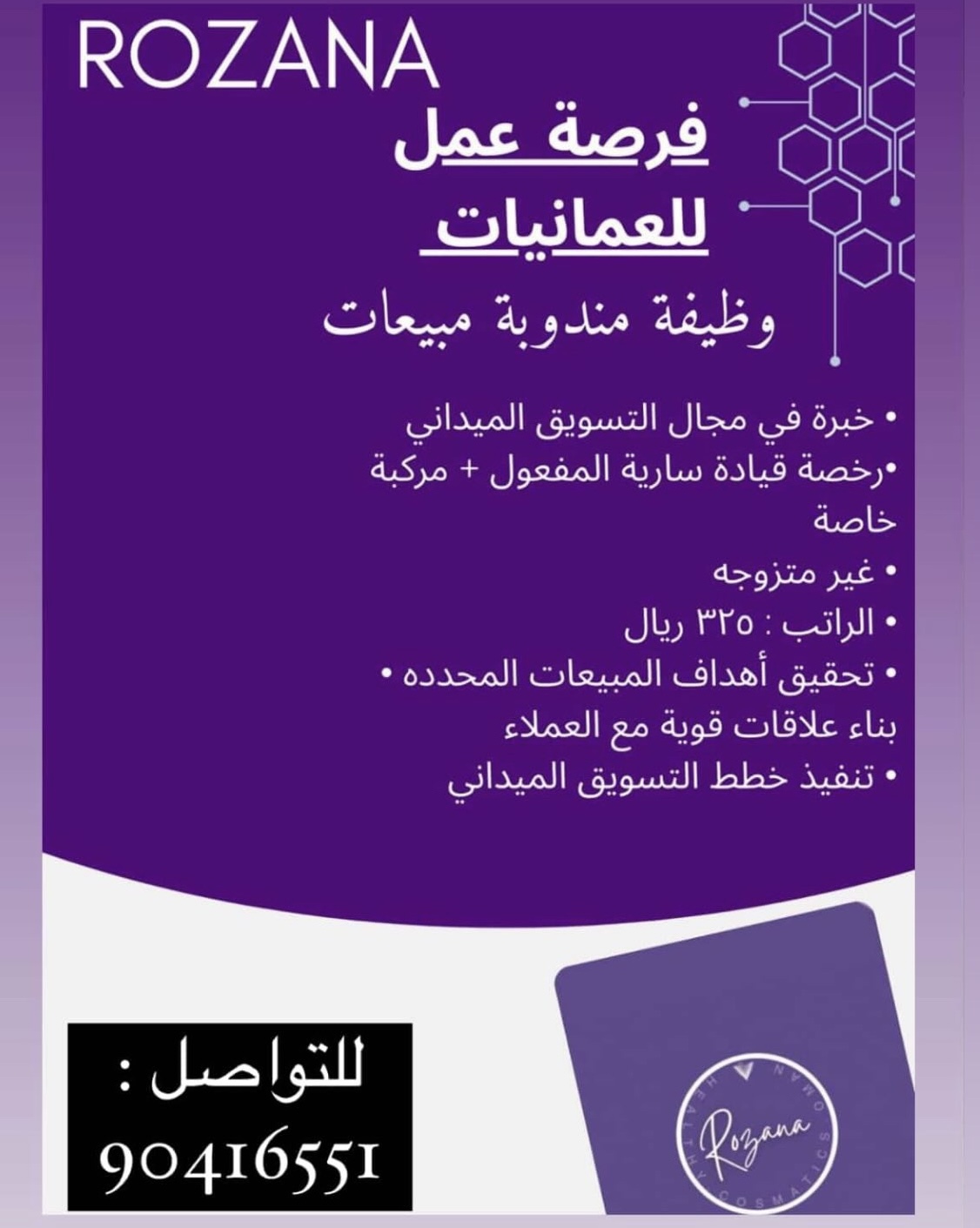 شركة روزانا في مسقط - وظيفة شاغرة ( مندوبة مبيعات )