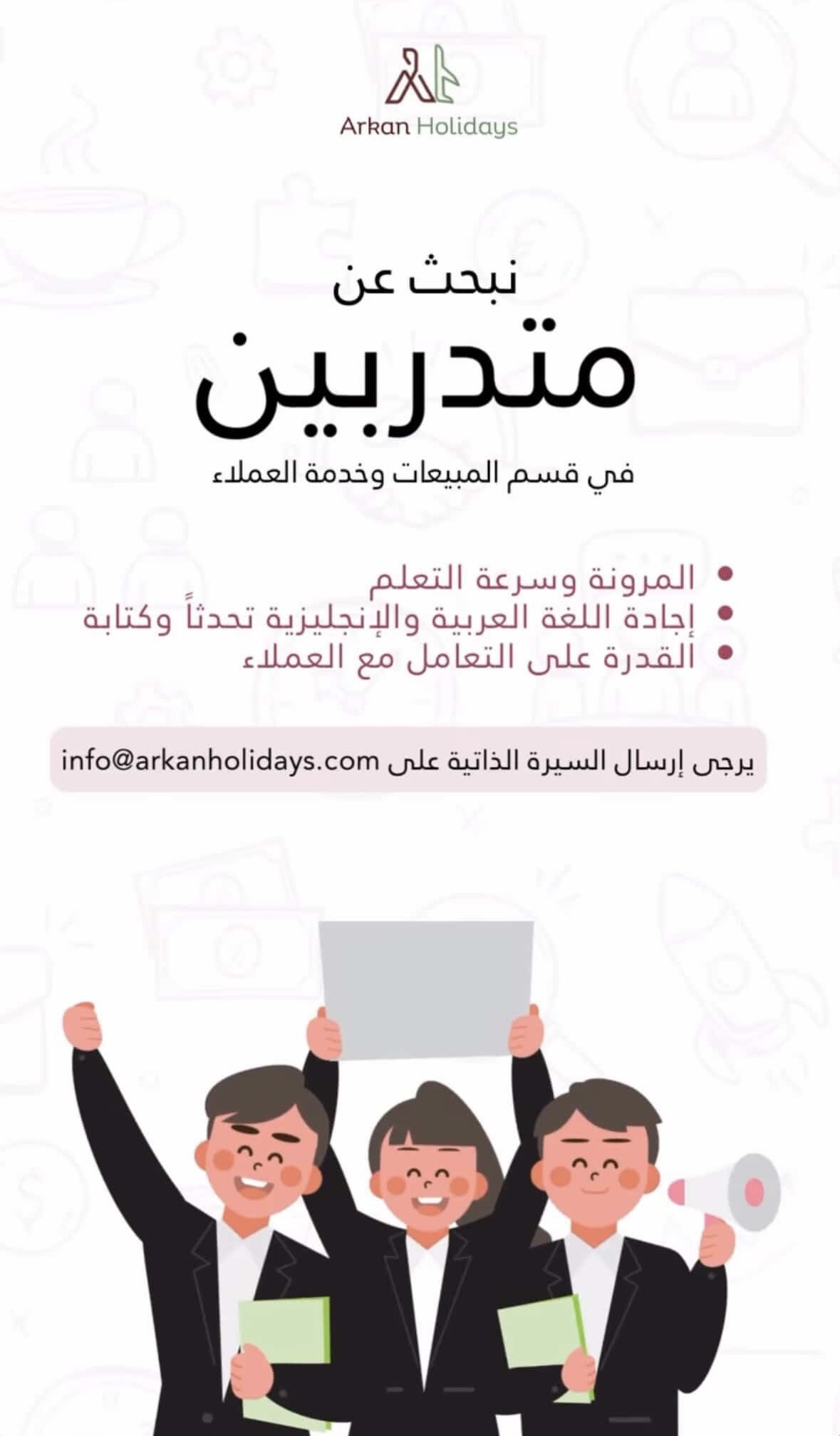 شركة أركان للعطلات - وظيفة شاغرة ( مندوبين في قسم المبيعات وخدمة العملاء )