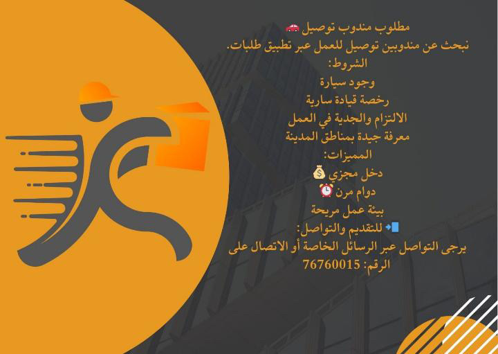 مندوب توصيل - فرصة شاغرة ( كباتن توصيل في ولايتي السيب وبوشر للعمل مع التفرغ بشكل كامل )