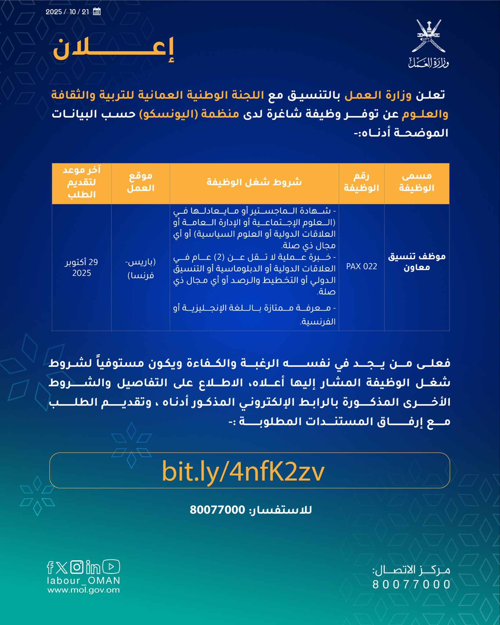 وزارة العمل بالتنسيق مع اللجنة الوطنية العمانية للتربية والثقافة والعلوم - وظيفة شاغرة لدى منظمة (اليونسكو)