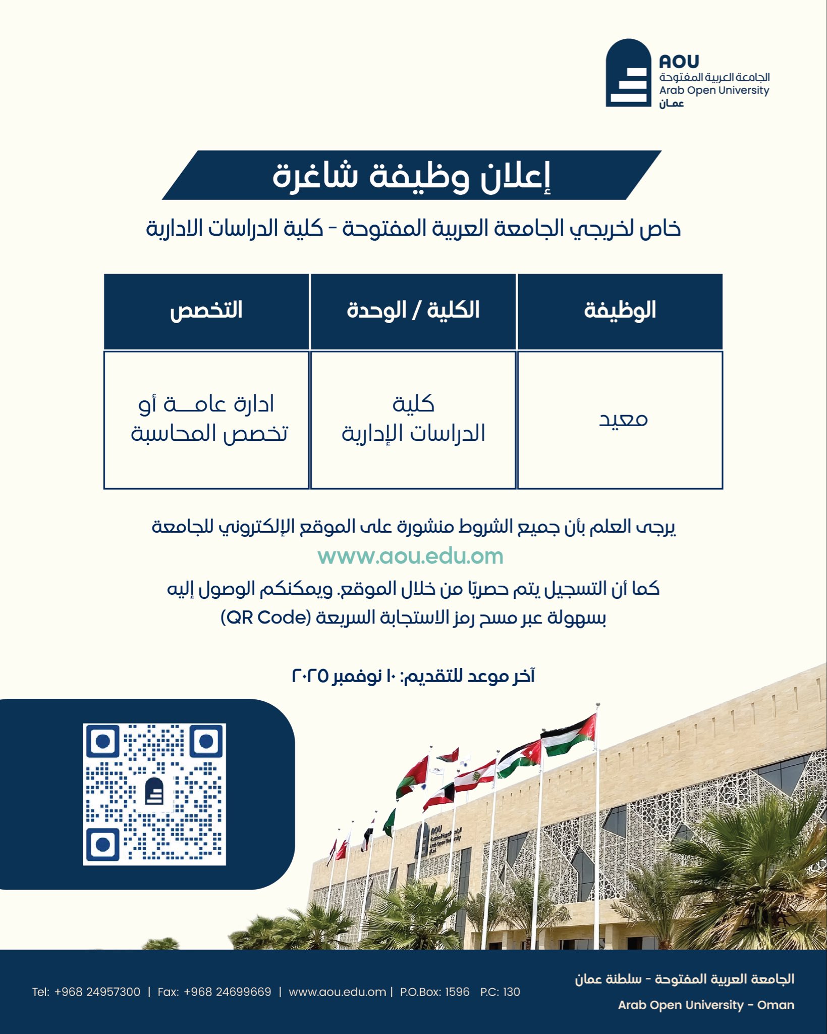 الجامعة العربية المفتوحة كلية الدراسات الإدارية - وظيفة شاغرة ( معيد )