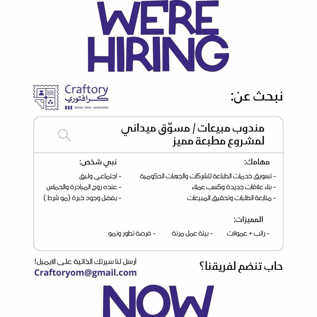مطبعة كرافتوري في بوشر - وظيفة شاغرة ( مندوب مبيعات / مسوّق ميداني )
