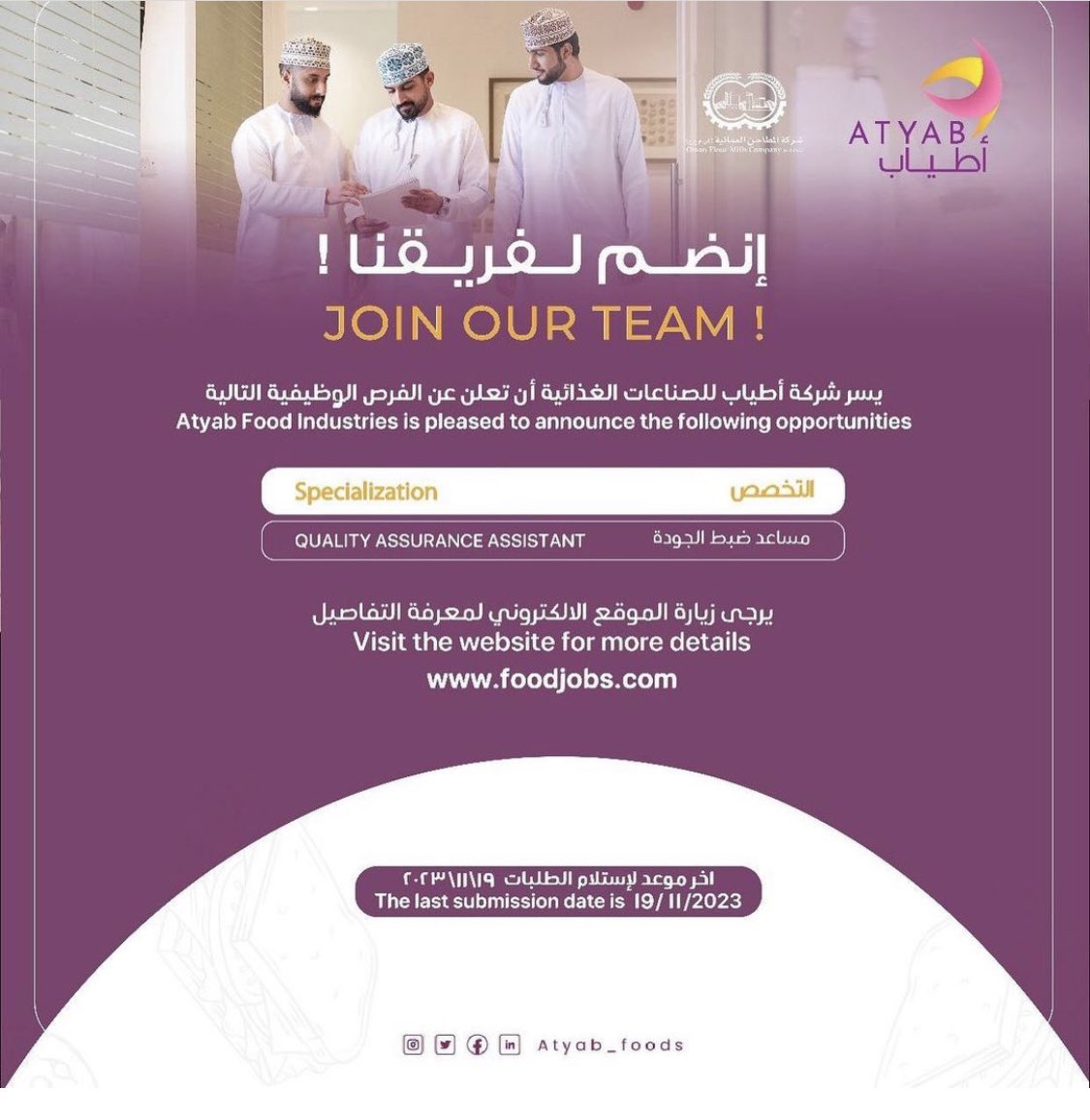 شركة أطياب - وظيفة شاغرة ( مساعد ضبط الجودة )