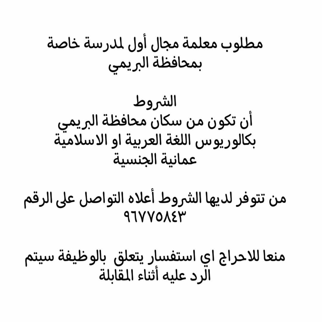 مدرسة خاصة في محافظة البريمي - وظيفة شاغرة ( معلمة مجال أول )