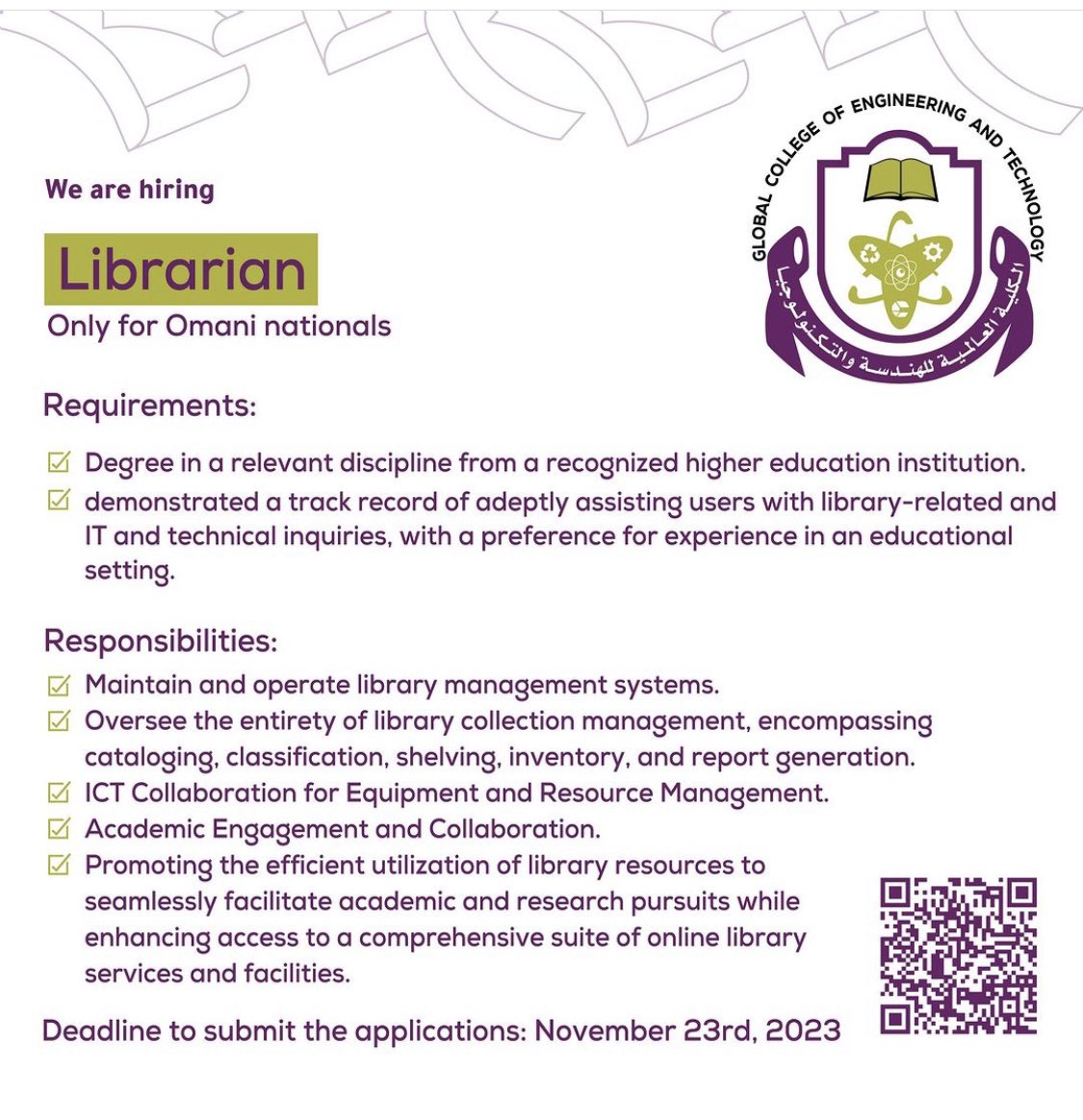 الكلية العالمية للهندسة والتكنولوجيا - وظيفة شاغرة ( أمين مكتبة )