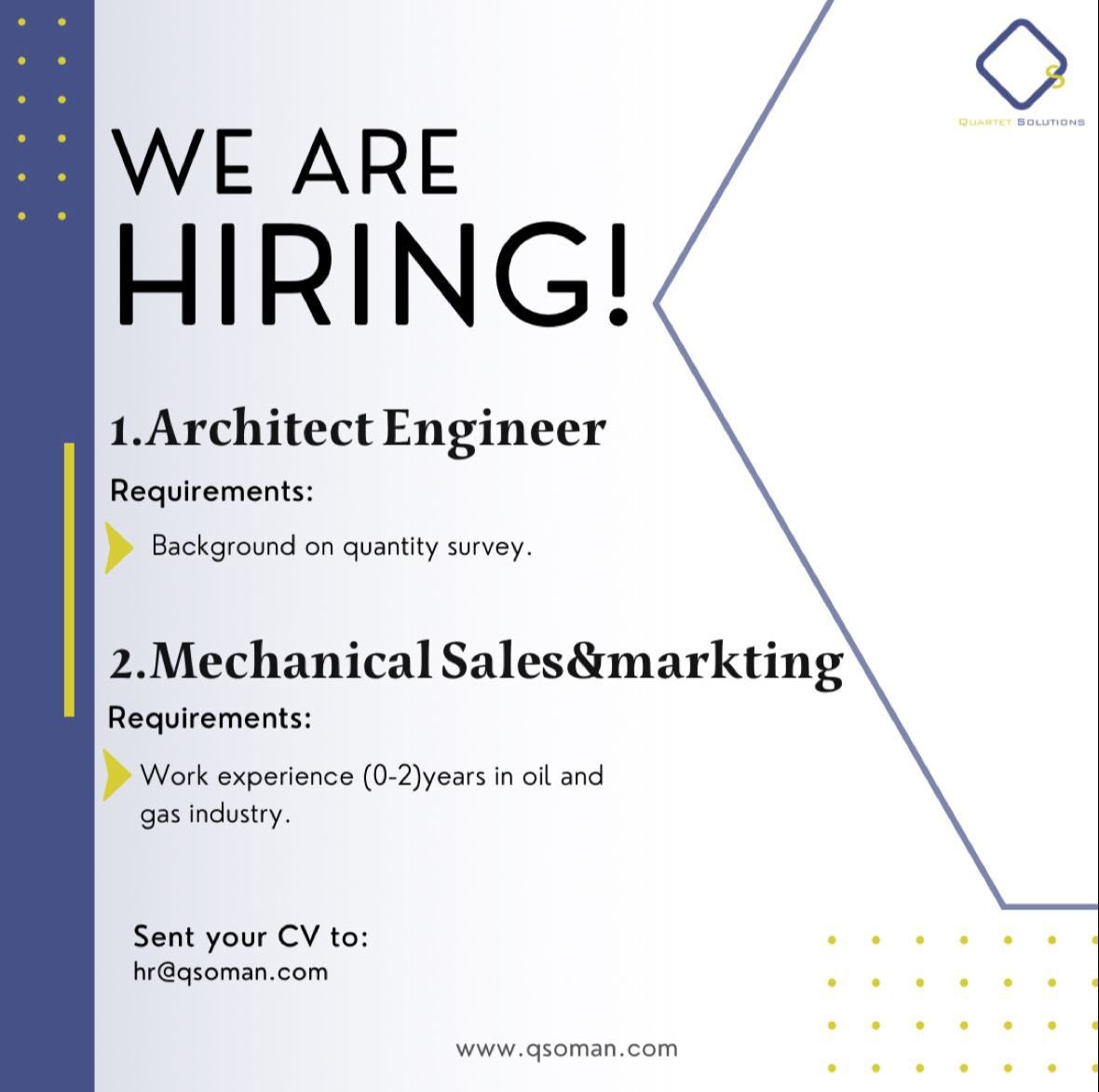 شركة Quartet Solutions في مسقط - فرص وظيفية ( مهندس معماري + تسويق ومبيعات ميكانيك )