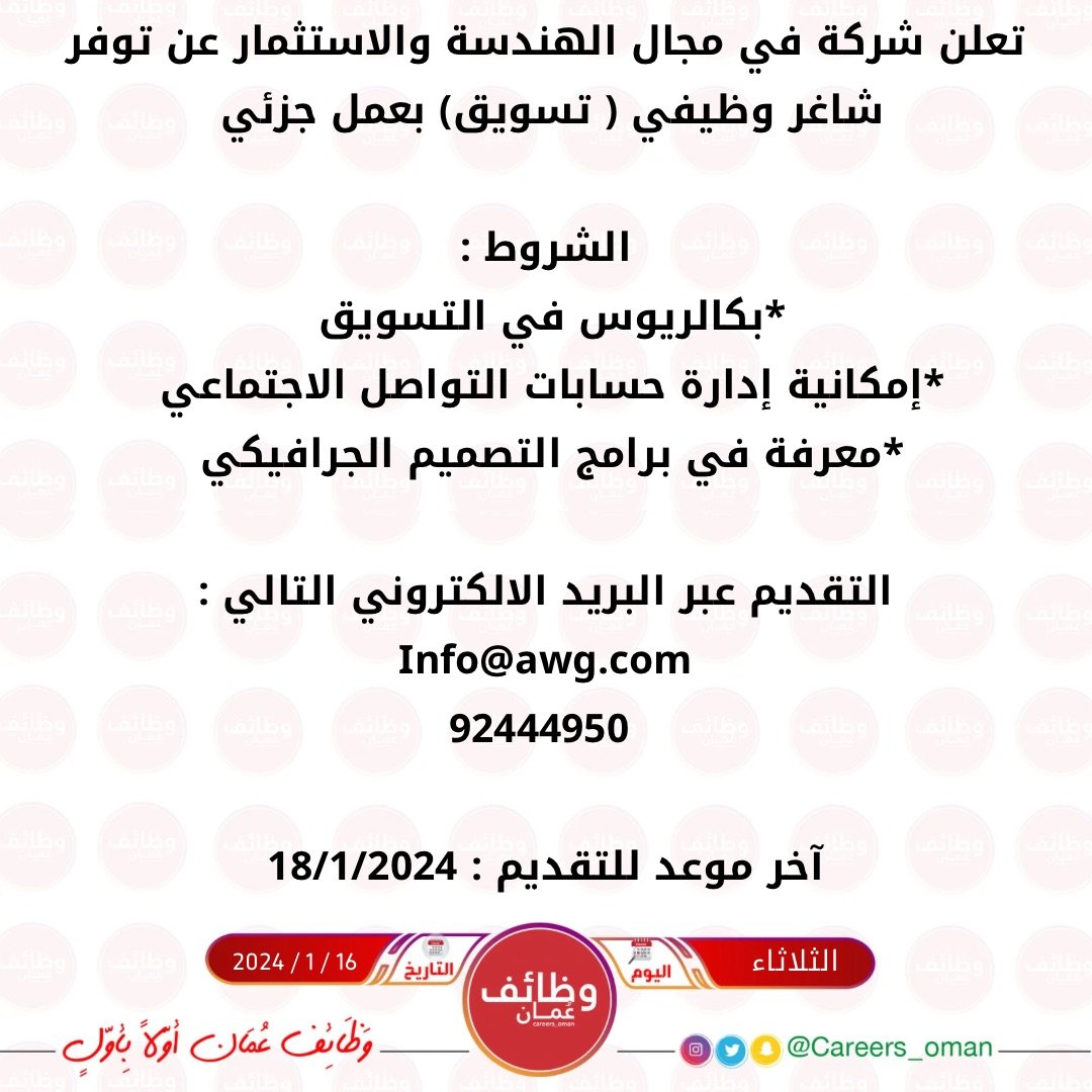 شركة رائدة في مجال الهندسة والاستثمار في مسقط - وظيفة شاغرة ( تسويق )