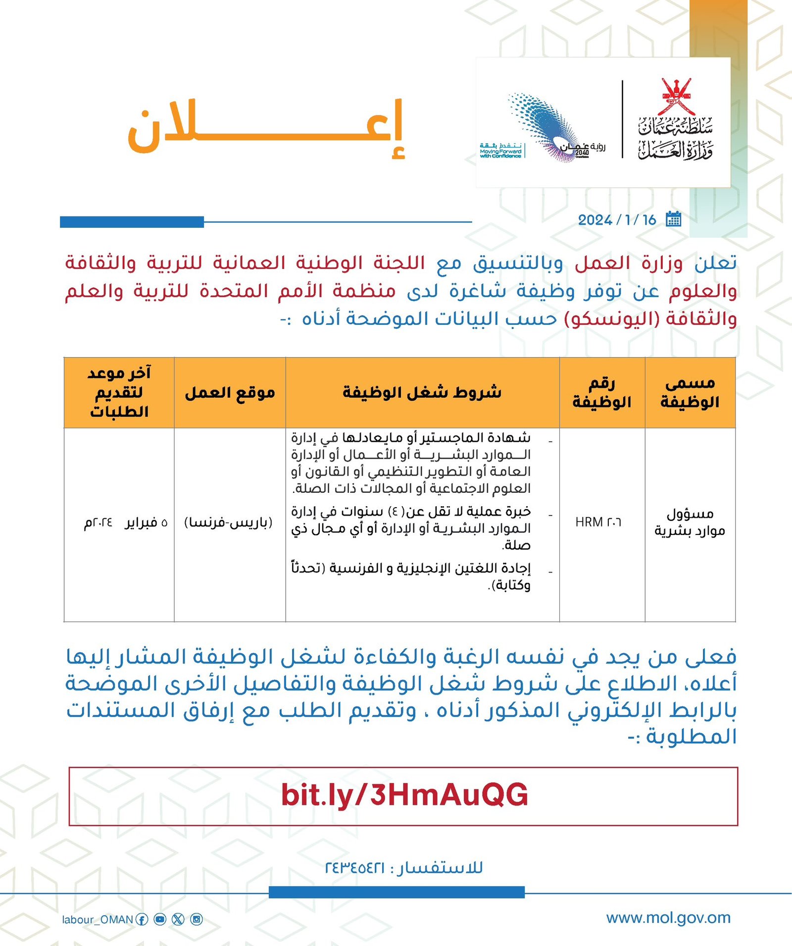 وزارة العمل بالتنسيق مع اللجنة الوطنية العمانية للتربية والثقافة والعلوم - توفر وظيفة شاغرة لدى منظمة الأمم المتحدة للتربية والعلم والثقافة (اليونسكو)