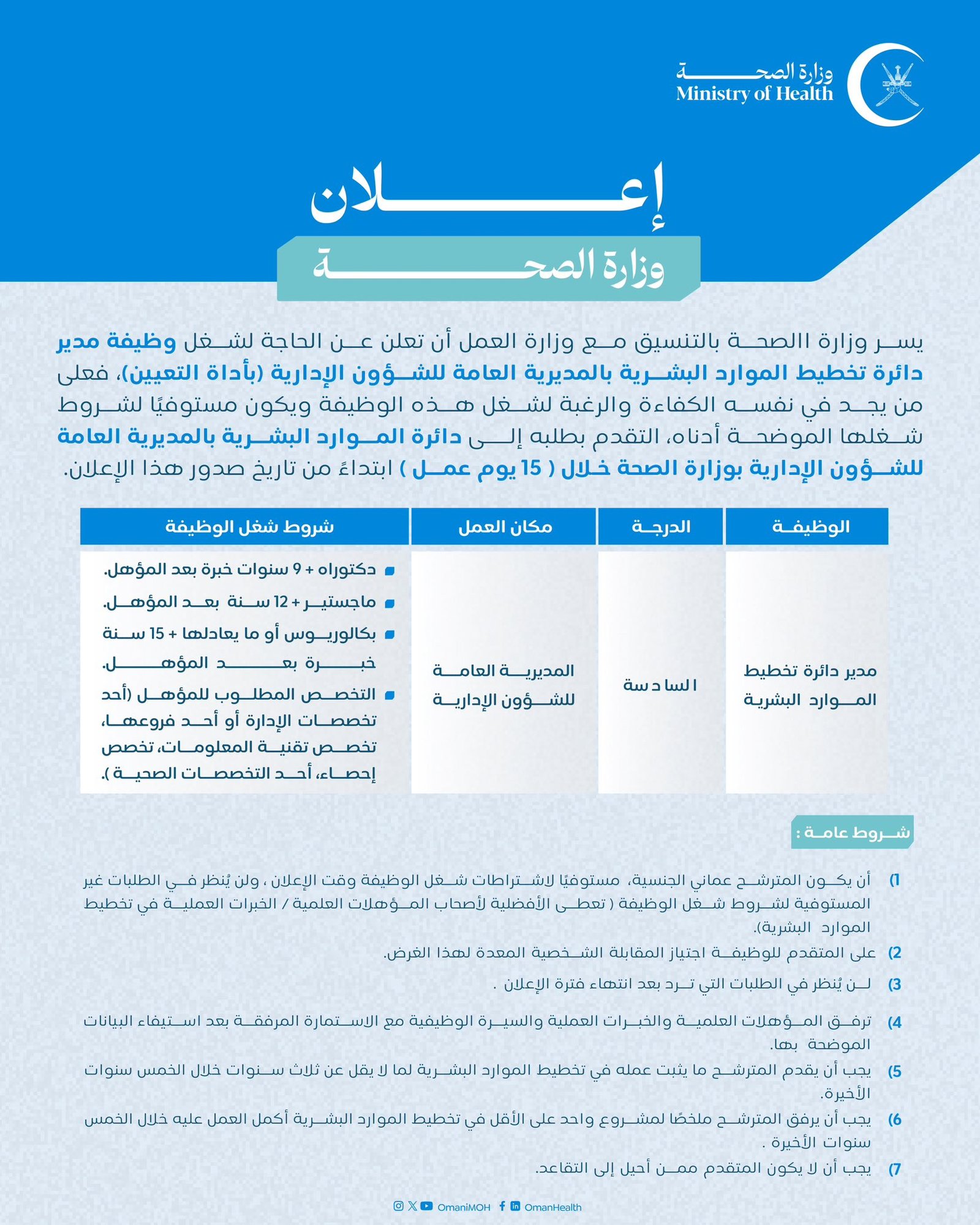 وزارة الصحة - وظيفة شاغرة ( مدير دائرة تخطيط الموارد البشرية بالمديرية العامة للشؤون الإدارية )