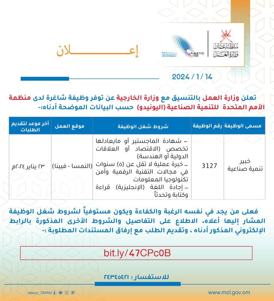 وزارة العمل بالتنسيق مع وزارة الخارجية - وظيفة شاغرة لدى منظمة الأمم المتحدة للتنمية الصناعية( اليونيدو)