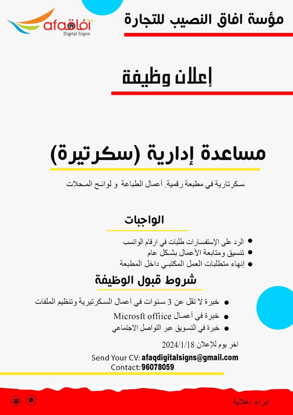 مؤسسة افاق النصيب للتجارة في إبراء - وظيفة شاغرة ( مساعدة إدارية / سكرتيرة )