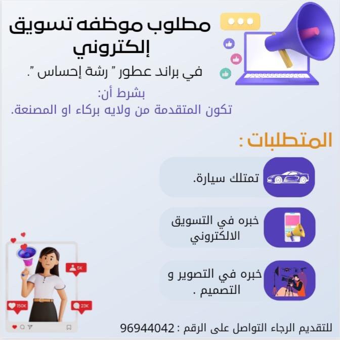براند عطور رشة إحساس - وظيفة شاغرة ( موظفة تسويق إلكتروني )