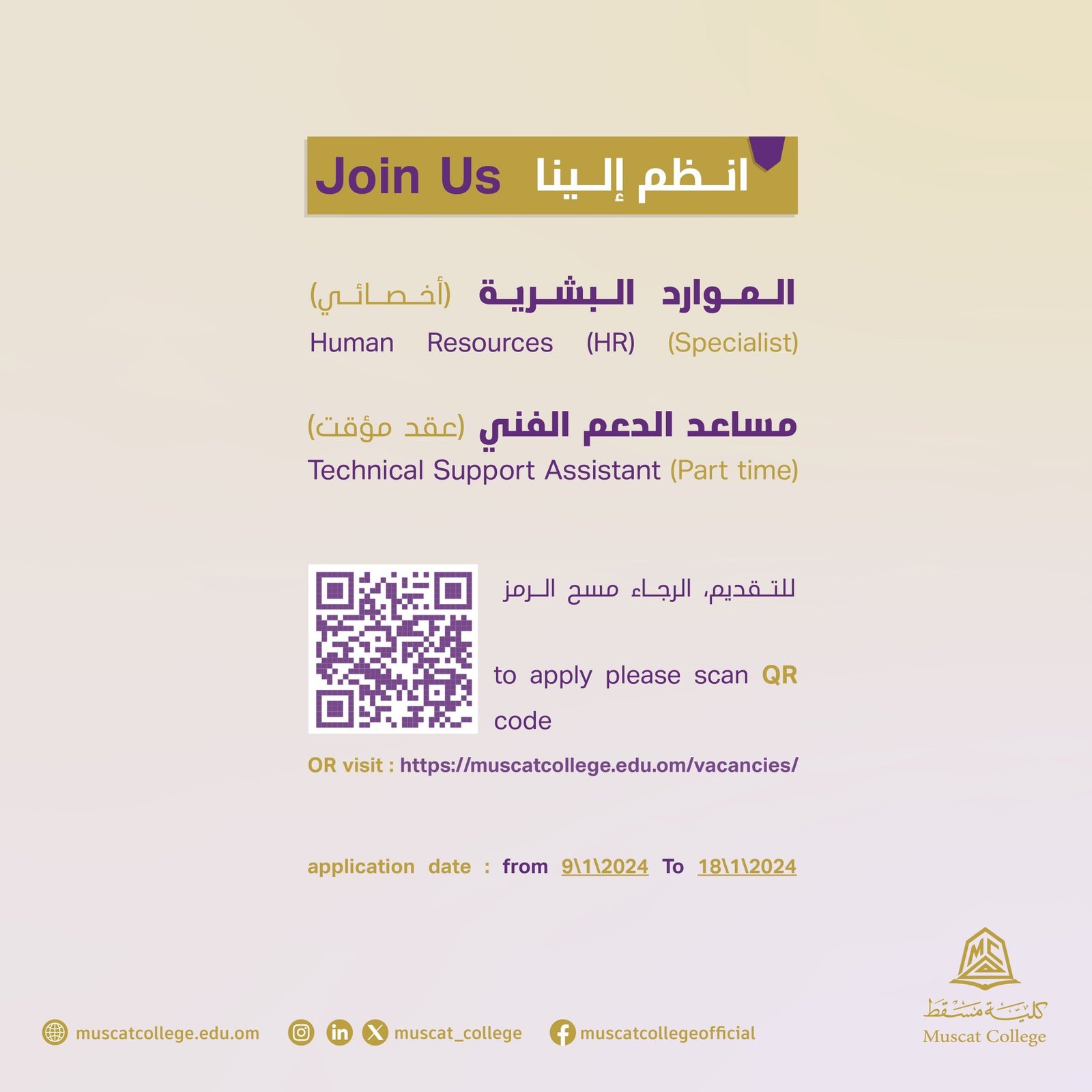 كلية مسقط - وظائف شاغرة ( الموارد البشرية + مساعد الدعم الفني )