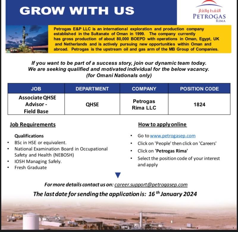 شركة النفط والغاز Petrogas Rima - وظيفة شاغرة ( Associate QHSE - Advisor Field Base )