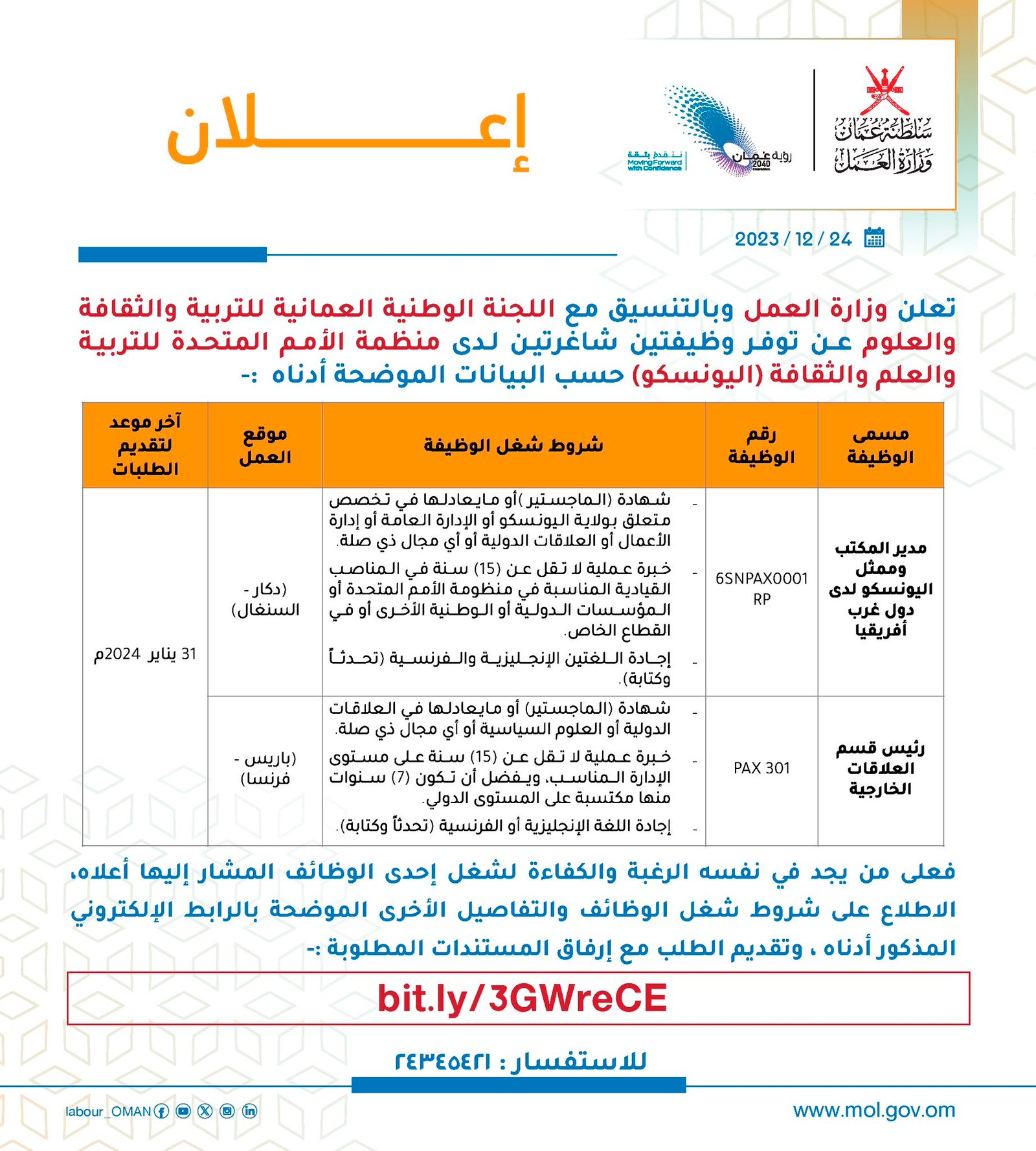 وزارة العمل وبالتنسيق مع اللجنة الوطنية العمانية للتربية والثقافة والعلوم - وظيفتين شاغرتين لدى منظمة(اليونسكو)