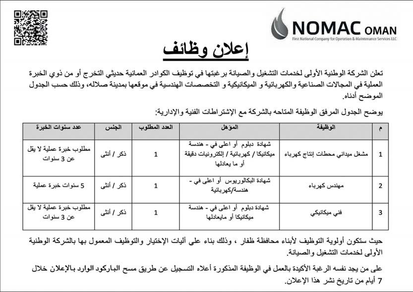 الشركة الوطنية الاولى لخدمات التشغيل والصيانة - 3 وظائف شاغرة