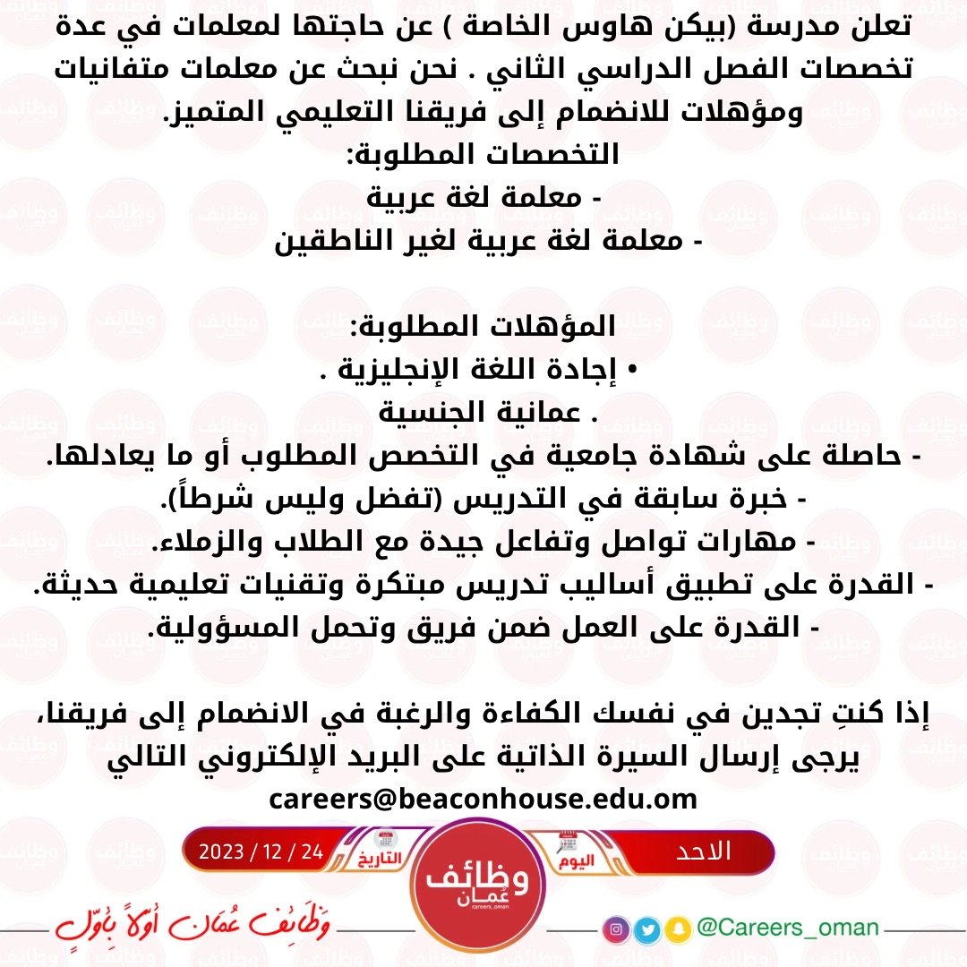 مدرسة بيكن هاوس الخاصة فرع الخوير - وظائف شاغرة ( معلمات )
