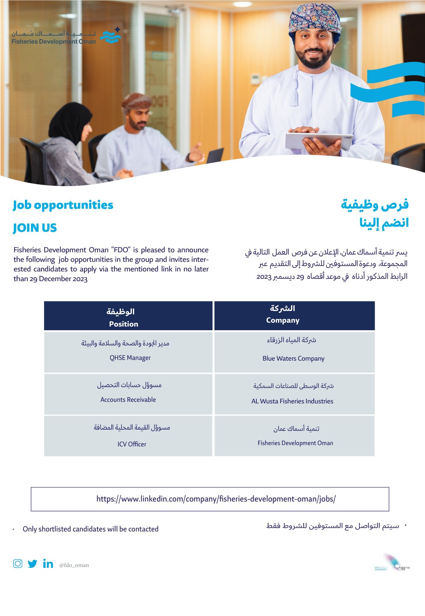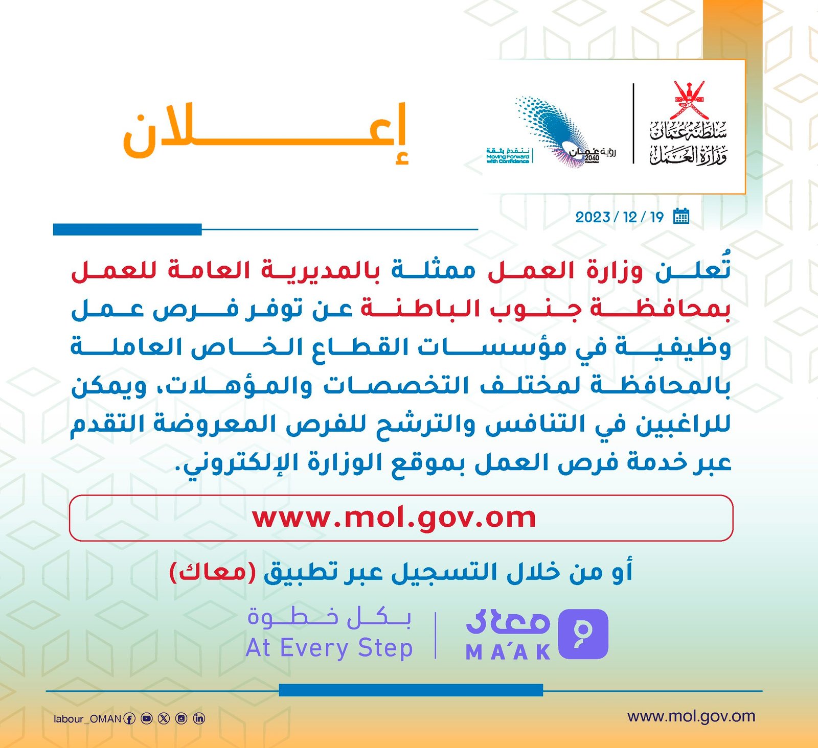 وزارة العمل ممثلة بالمديرية العامة للعمل بمحافظة جنوب الباطنة عن توفر فرص عمل وظيفية في مؤسسات القطاع الخاص