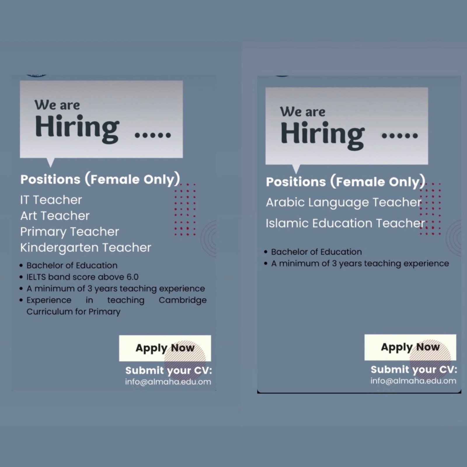 مدرسة المها الخاصة في مدينة السلطان قابوس - وظائف التدريسية الشاغرة