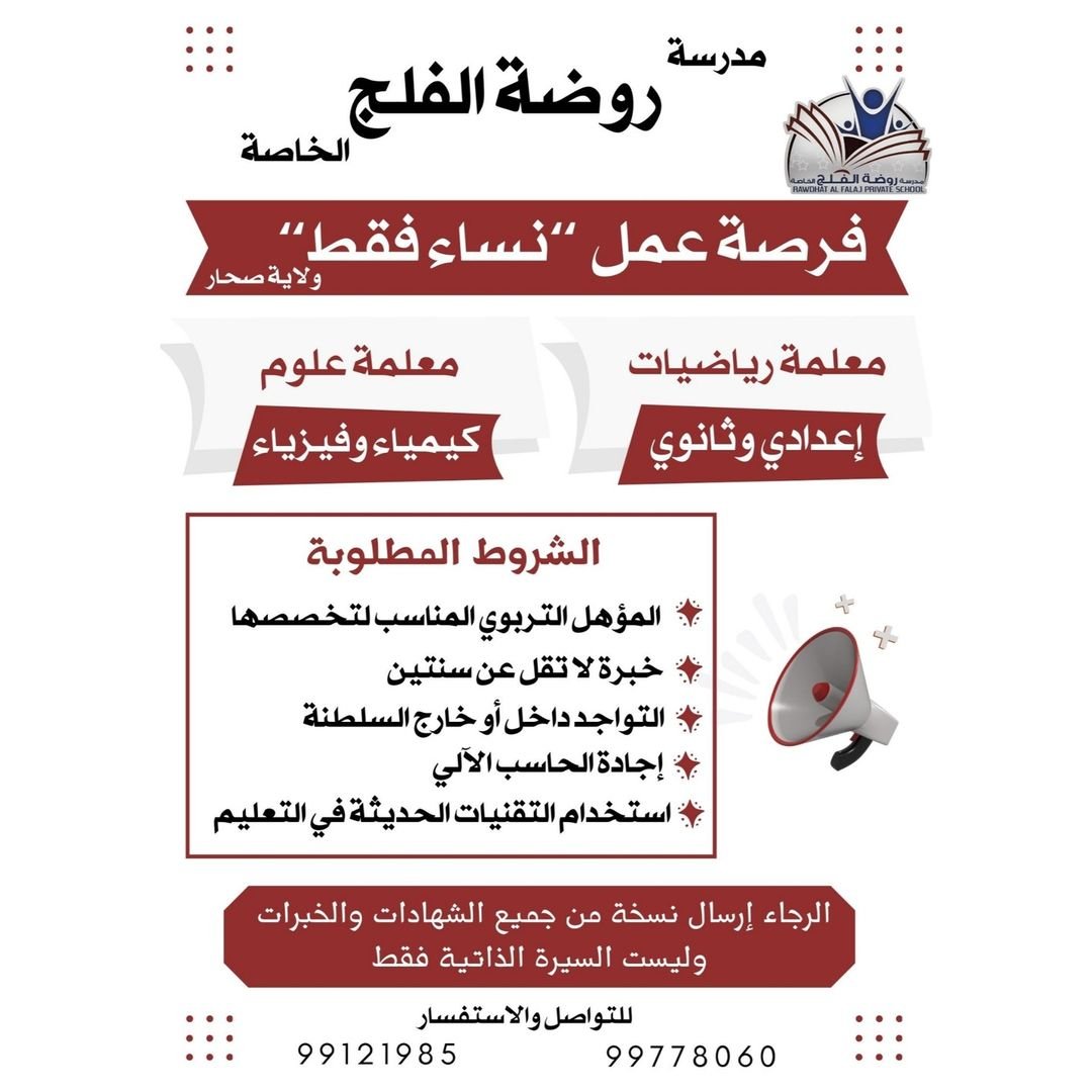 مدرسة روضة الفلج الخاصة بولاية صحار - وظائف شاغرة ( معلمات )