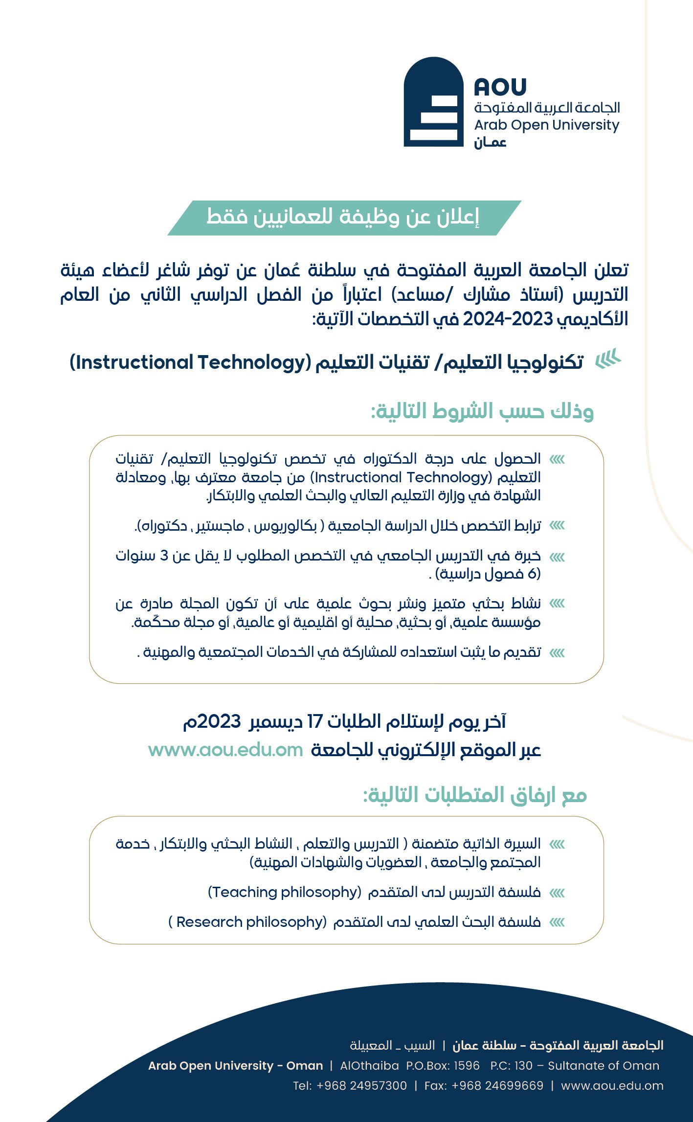الجامعة العربية المفتوحة - وظيفة شاغرة ( استاذ مشارك / مساعد )