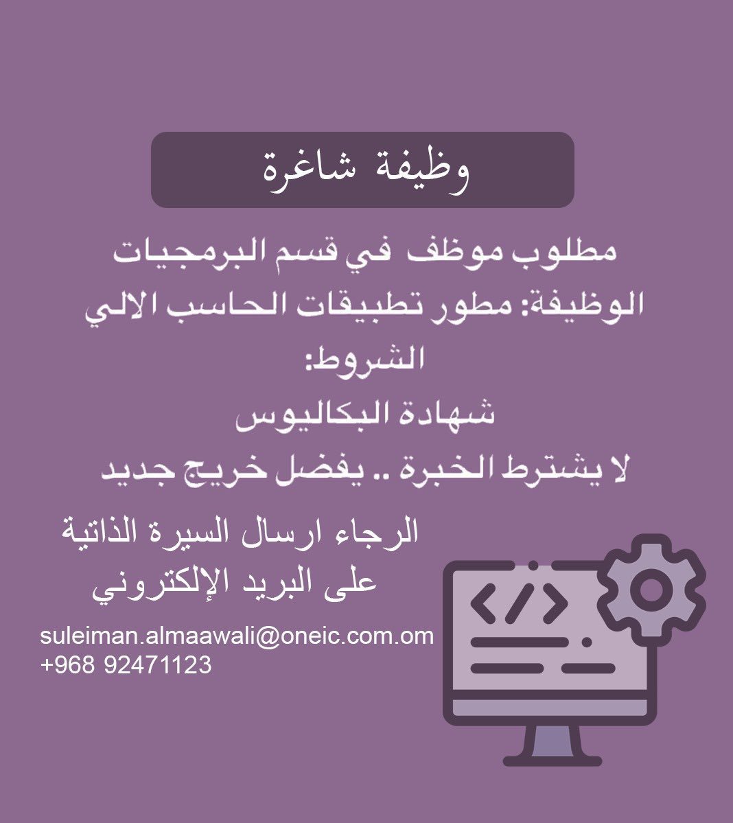 احدى الشركات الرائدة - وظيفة شاغرة ( مطور تطبيقات الحاسب الالي )