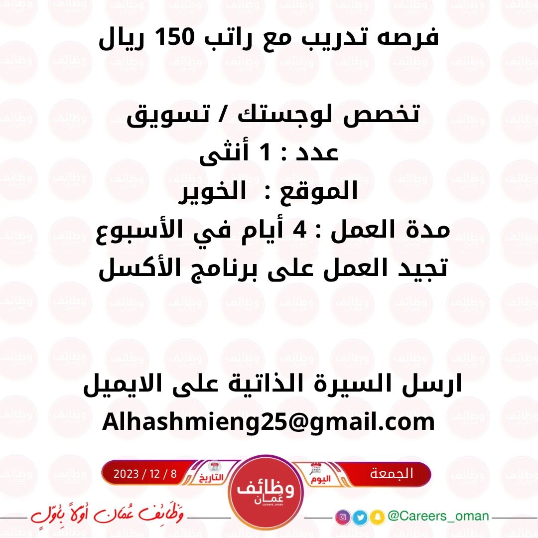 شركة رائدة في الخوير - فرصه تدريب مع راتب 150 ريال ( تخصص لوجستك/تسويق انثى )