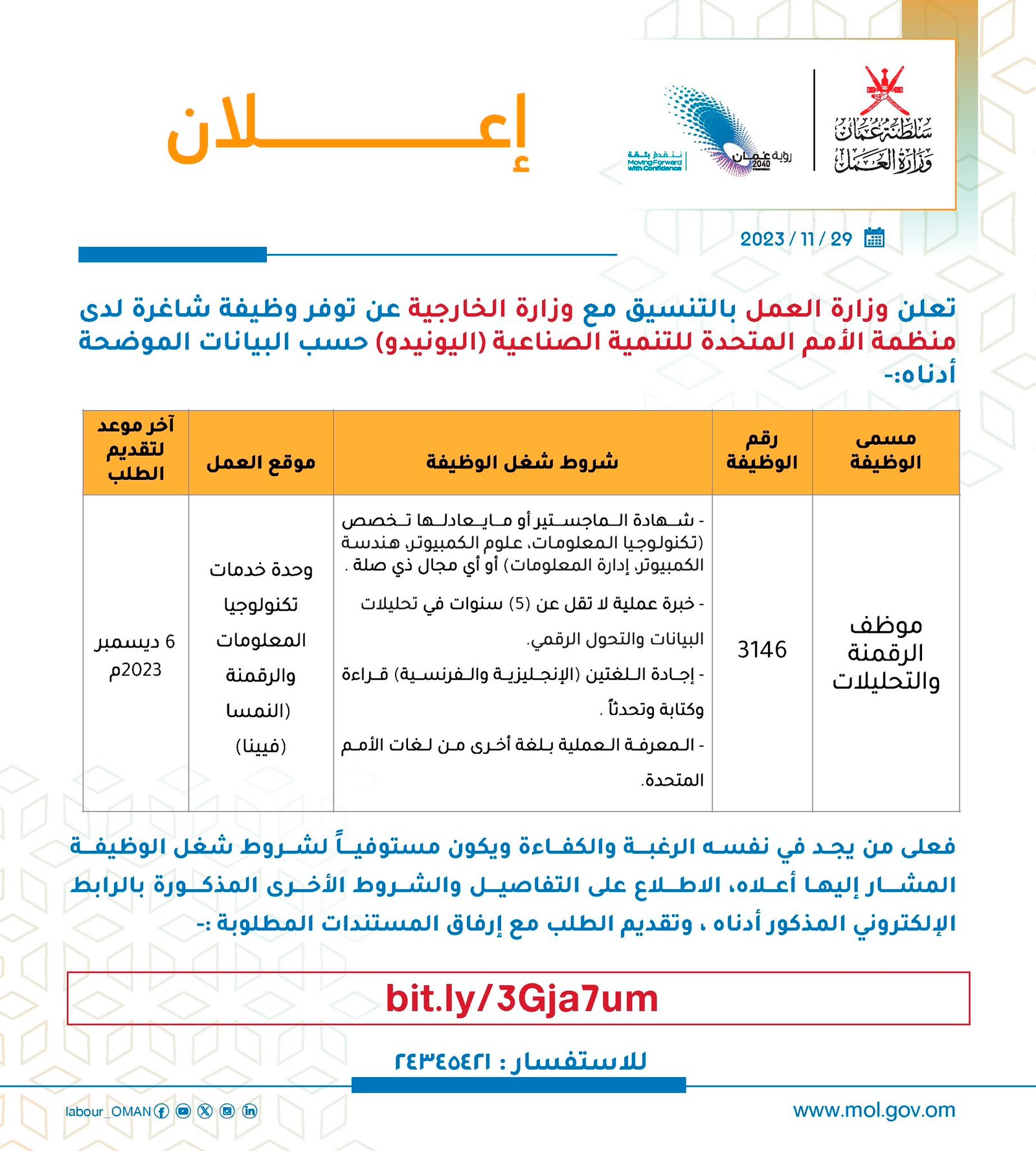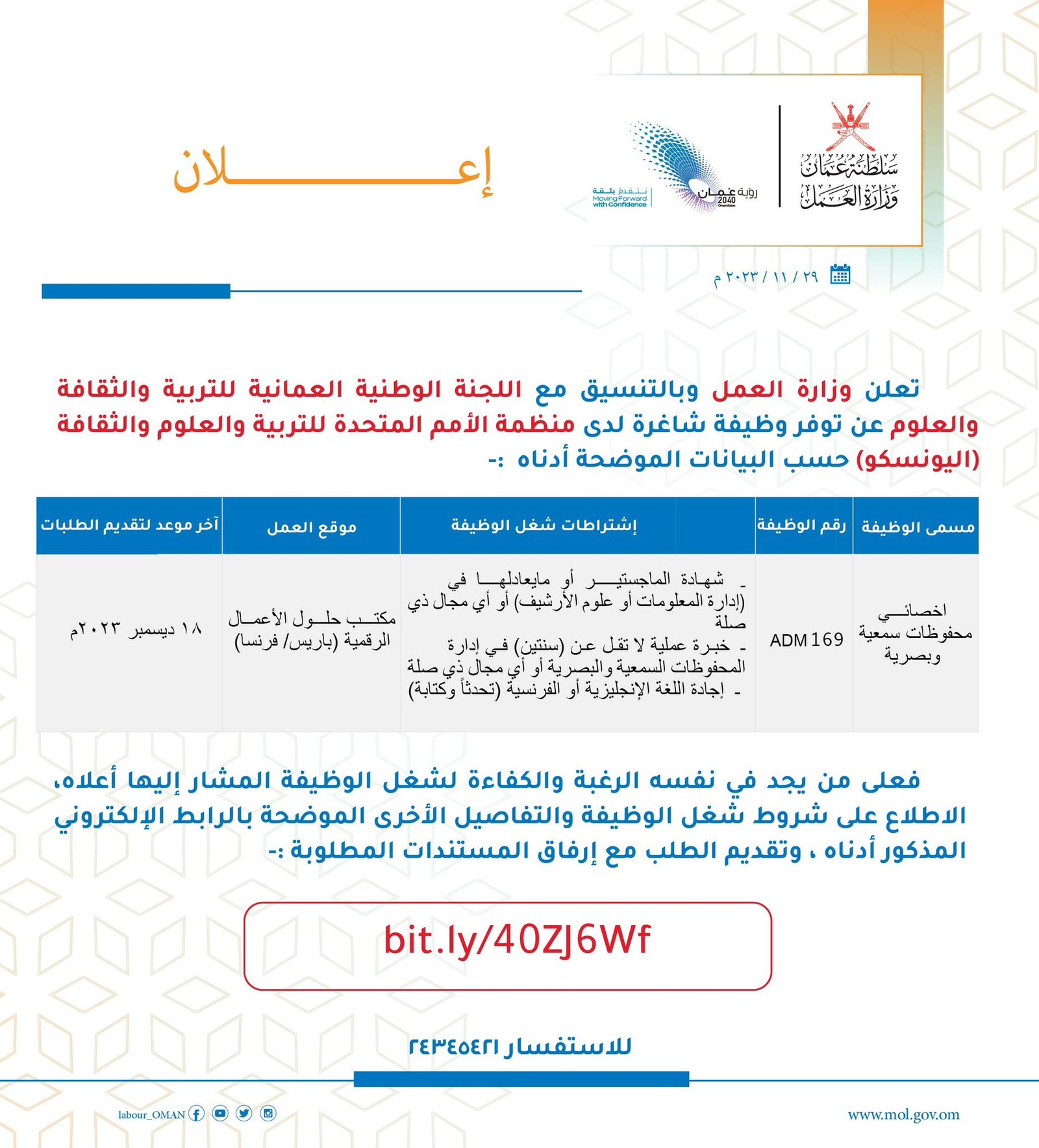 وزارة العمل وبالتنسيق مع اللجنة الوطنية العمانية للتربية والثقافة والعلوم عن توفر وظيفة شاغرة لدى منظمة الأمم المتحدة للتربية والعلوم والثقافة (اليونسكو )