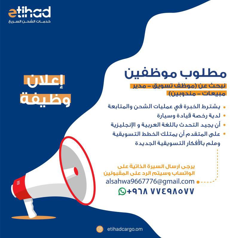 الإتحاد للشحن - وظائف شاغرة ( موظف تسويق + مدير مبيعات + مندوبين )