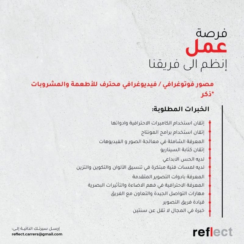 شركة reflect - وظيفة شاغرة ( مصور فوتوغرافي/ فيديوغرافي )