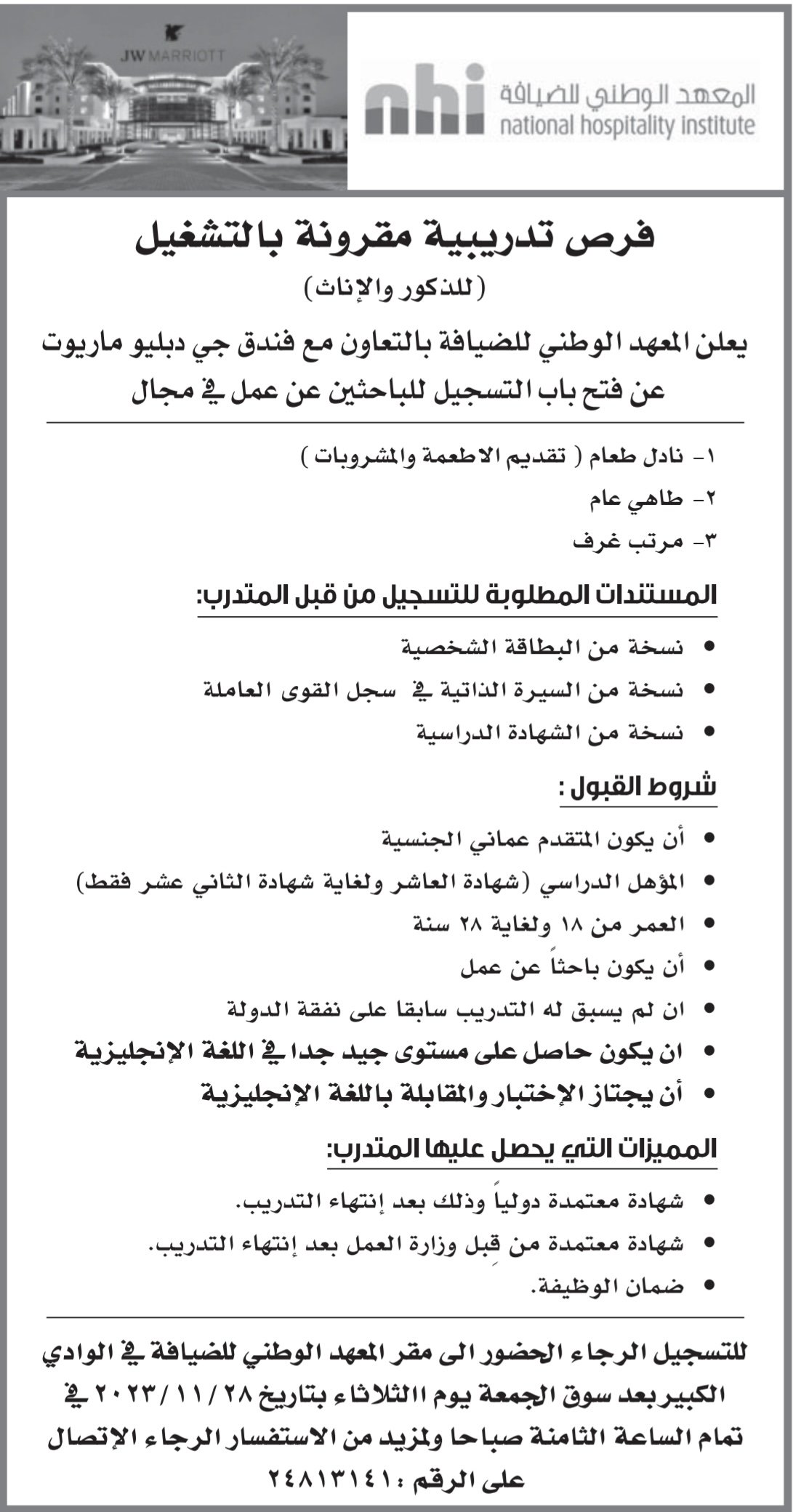 المعهد الوطني للضيافة بالتعاون مع فندق جي دبليو ماريوت - فرص تدريبية مقرونة بالتشغيل