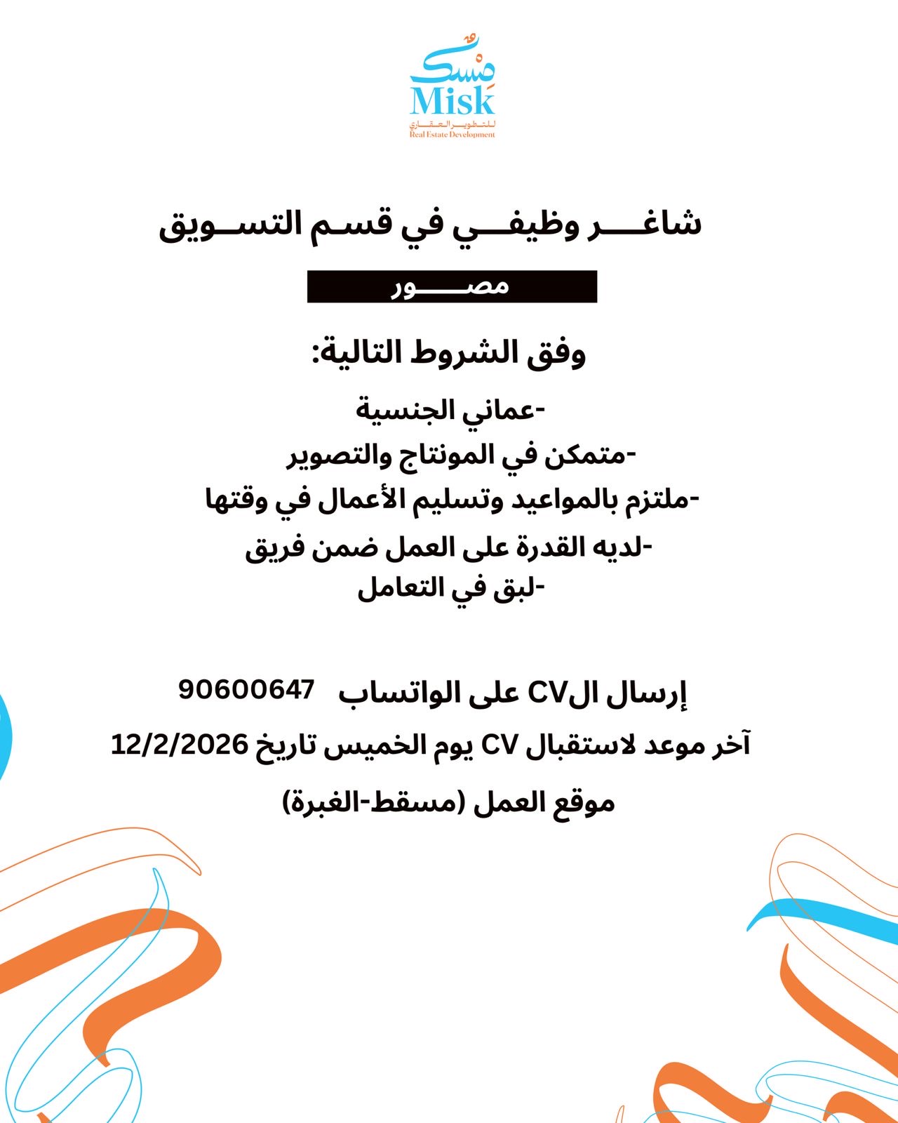 شركة مسك للتطوير العقاري - فرص وظيفية شاغرة ( مصور + تسويق )