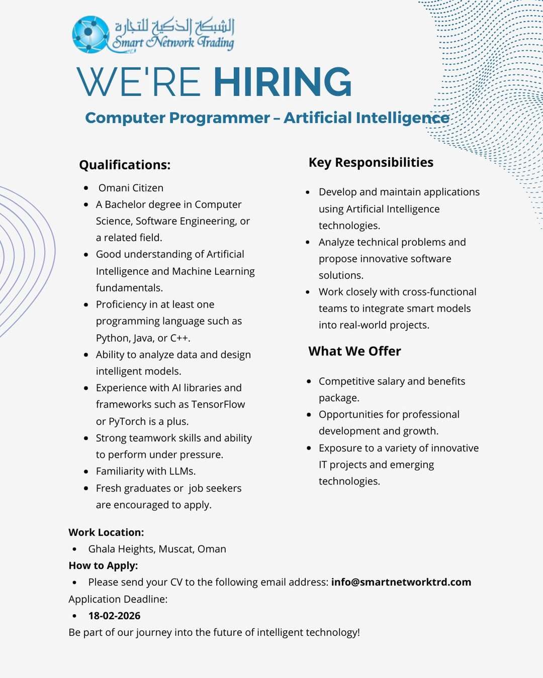 الشبكة الذكية للتجارة في مسقط - وظيفة شاغرة ( Computer Programmer )
