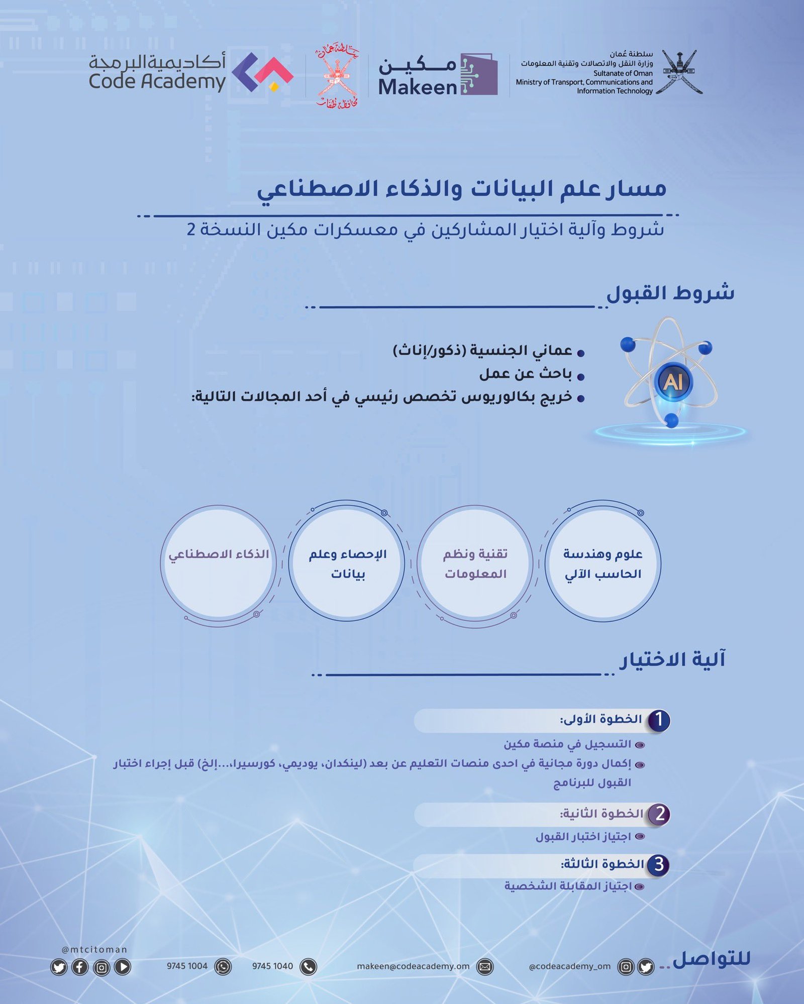 وزارة النقل والاتصالات وتقنية المعلومات وبالتعاون مع محافظة ظفار - تطلق معسكرات مكين صلالة لتمكين الباحثين عن عمل في علم البيانات والذكاء الاصطناعي وتطوير تطبيقات الويب