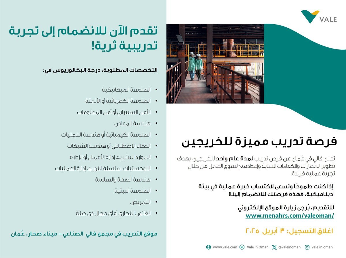 شركة فالي عمان - فرصة تدريب مميزة للخريجين في 12 تخصص لمدة عام واحد