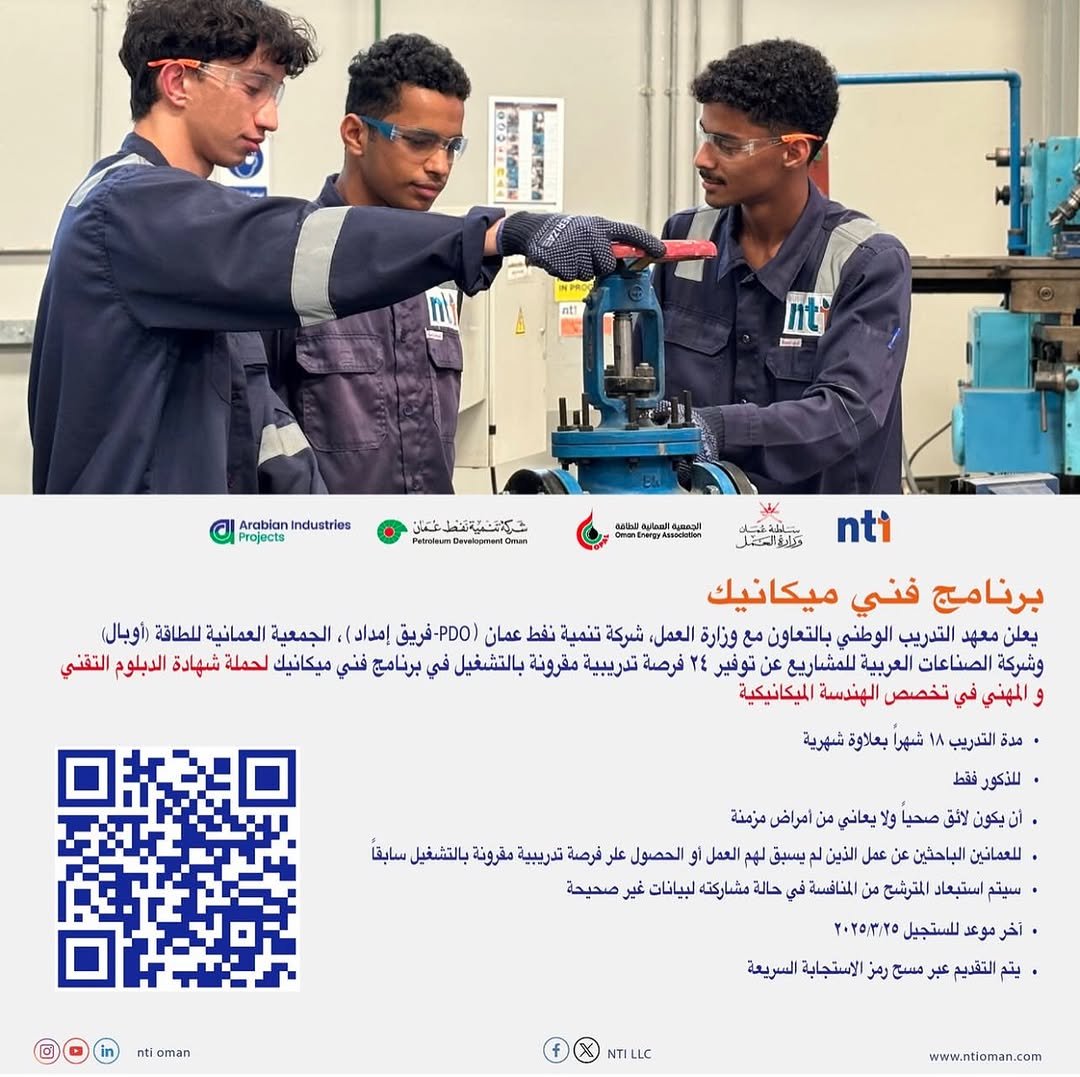 معهد التدريب الوطني - توفر 24 فرصة تدريبية مقرونة بالتشغيل في برنامج فني ميكانيك