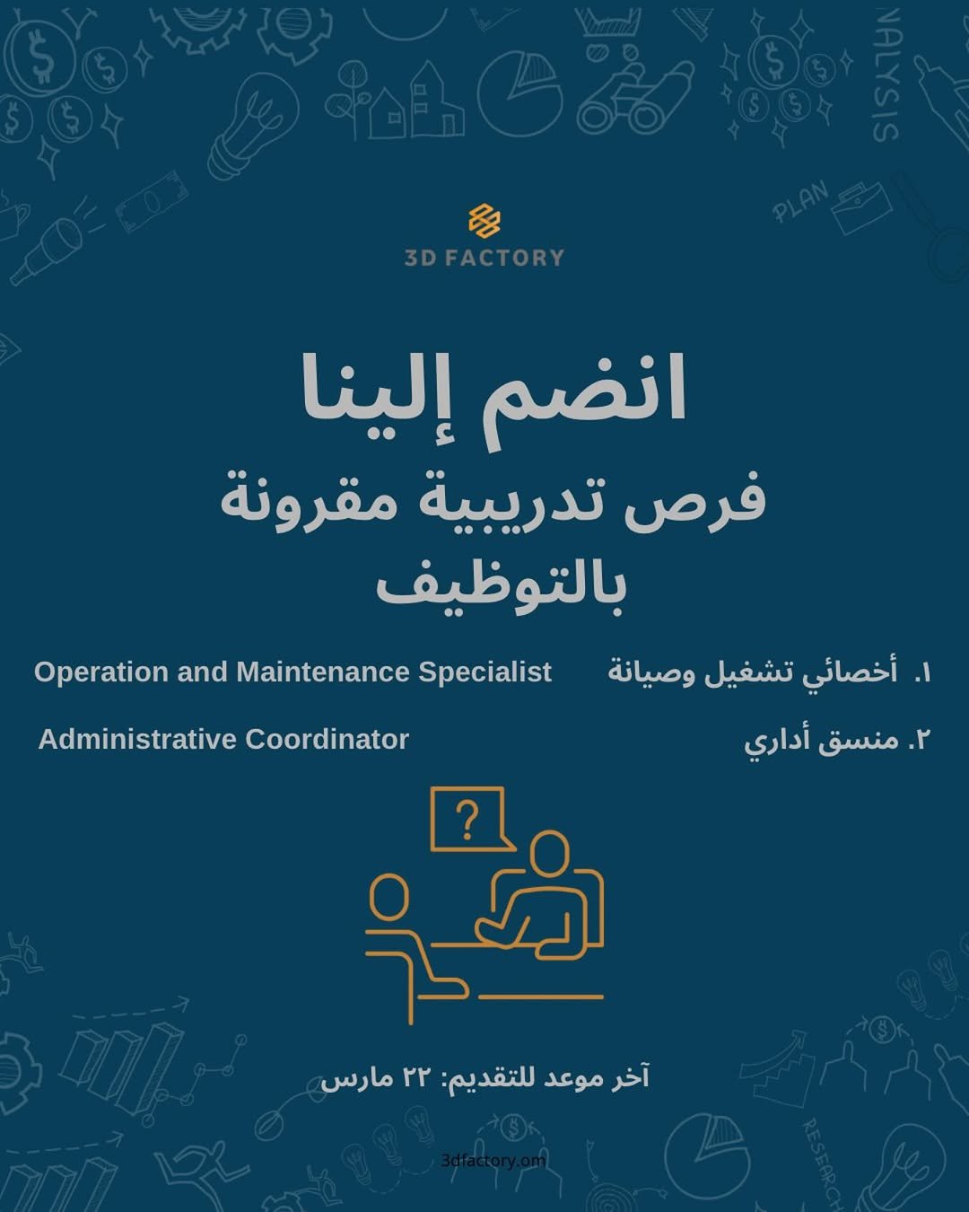 شركة ثري دي فاكتوري - فرص تدريبية مقرونة بالتوظيف ( أخصائي تشغيل وصيانة + منسق أداري )